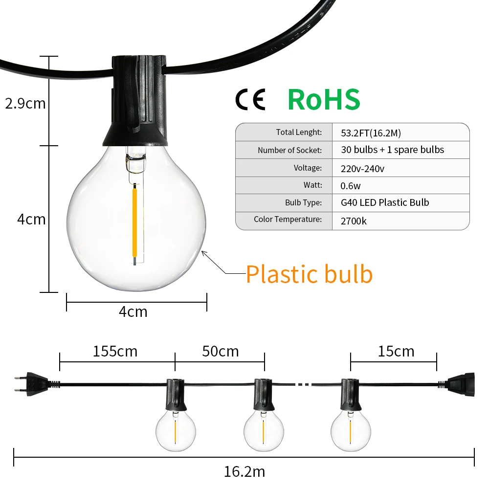 16 м 18 м гисветильник да s, небьющаяся сказочная гирлянда s G40, уличная гирлянда s G40, новогоднее и Свадебное украшение