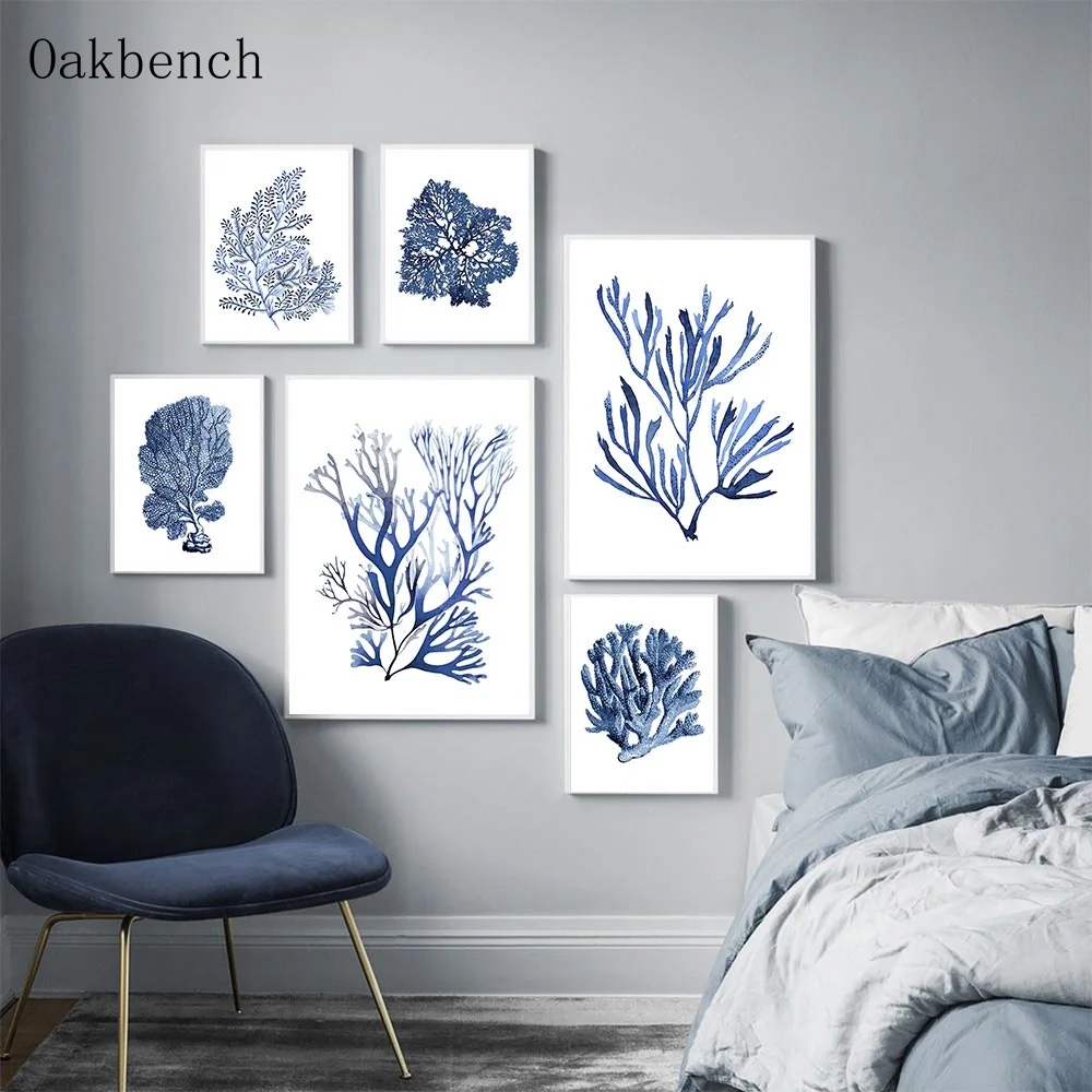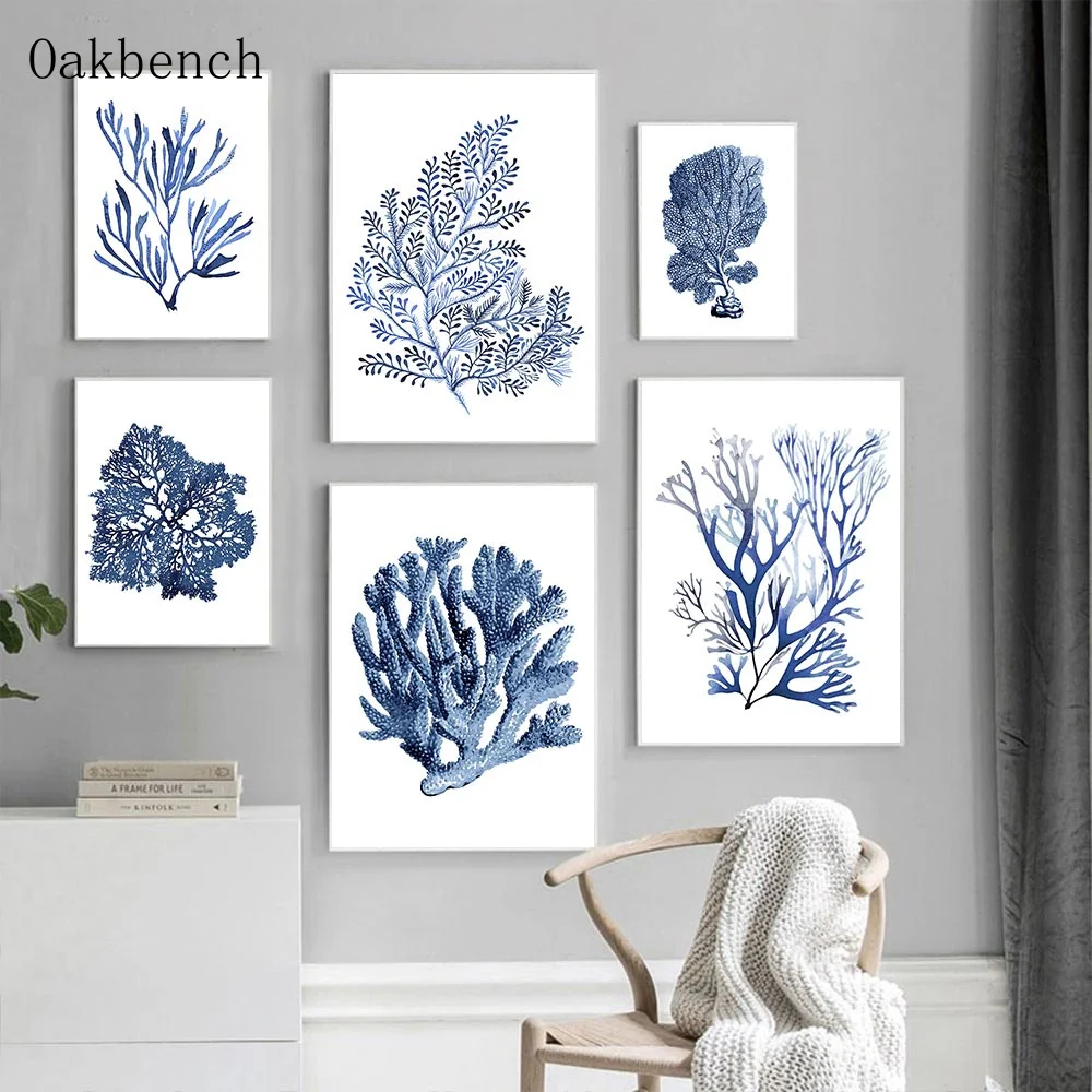 Абстрактная настенная живопись, изображение растений, коралловые холсты, плакаты, современный принт, синий плакат, скандинавские настенные картины для декора гостиной