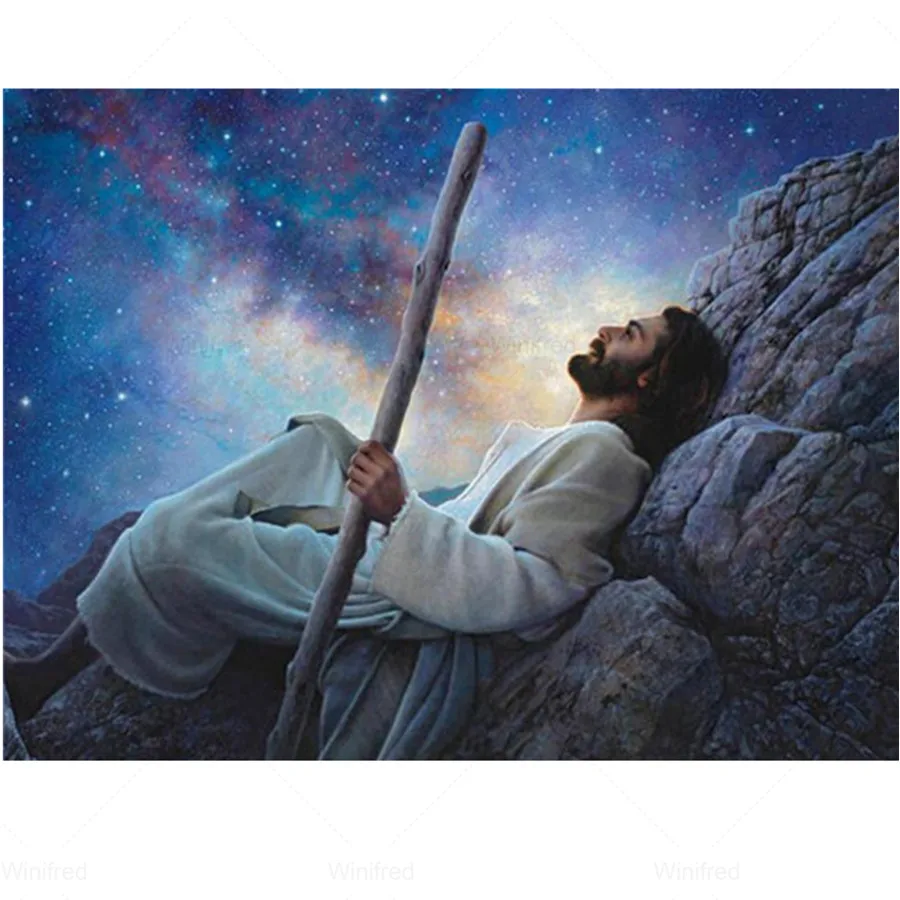 Алмазная живопись с Иисусом, картина ручной работы с ночным небом, полноразмернаякруглая вышивка, мозаика, религиозный Декор для дома, настенное искусство, подарок