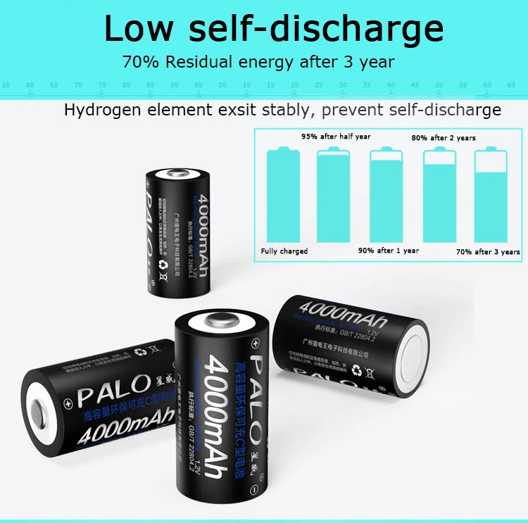 Параметры батареи: Название: C размер Тип батареи: ni-mh аккумуляторная батарея Напряжение: 1,2 V Емкость: 4000 мА-ч Введение: Перезаряжаемая батарея размера PALO C является более экологически чистой, батарея изготовлена из никель-металл-гидридного материала, низкий саморазряд, может быть перезаряжена в 1200-1800 раз, экономит больше денег, чем одноразовые батареи. Зарядное устройство параметры: Бренд: PALO Название: 4 слота для быстрой зарядки Режим: ЖК-дисплей Входное напряжение: 100-240 В переменного тока, 50/60 Гц Выход: AA/AAA/C/D 1-1.8A 9V 25mA Для: AA/AAA/C/D/9 В аккумуляторная батарея Размер: 195*90*50 мм Спецификация: 1. Это зарядное устройство может заряжать 1-4 шт. AA AAA C D Размер Ni-mh или Ni-Cd батареи и 1-2 шт. 9 в Ni-MH или NI-CD аккумулятор. 2. Умный чип контролирует процесс зарядки. 3. ЖК-экран и светодиодная подсветка показывают процесс зарядки, ЖК-дисплей для AA AAA C D батареи, светодиод для 9 В батареи. 4. Независимый зарядный канал, множественная защита, поддержка быстрой разрядки. 5. В конце процесса зарядки Встроенный микрокомпьютер преобразует режим зарядки от быстрой зарядки в струйную зарядку, убедитесь, что батареи полностью заряжены и предотвращают перезарядку; 6. Постоянный ток предотвращает колебания тока, обеспечивает безопасность зарядки; 7. Зарядное устройство строго контролирует максимальное время зарядки, убедитесь, что аккумуляторы заряжаются одновременно; 8. Функция автоматического распознавания: Уникальный алгоритм обнаружения поврежденных или дефектных ячеек, автоматическое обнаружение нетарифицируемых или одноразовых батарей и остановка зарядки;