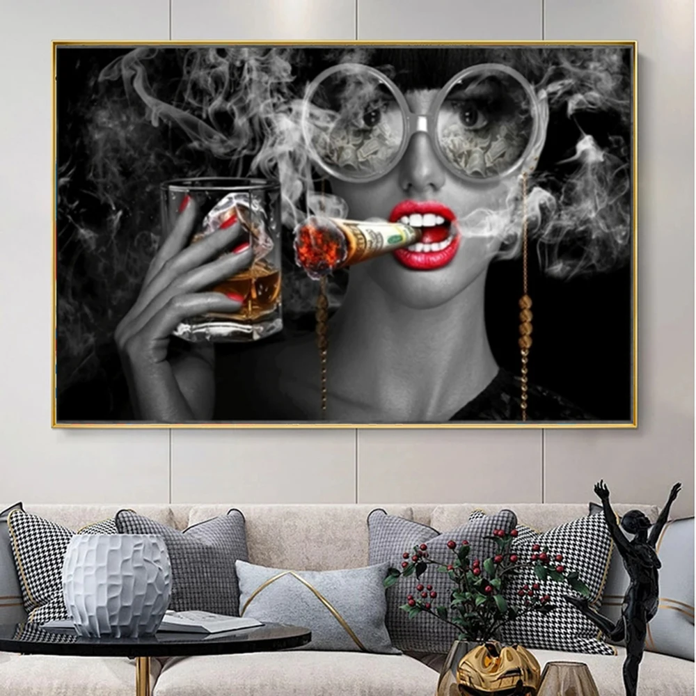 Картина на холсте с изображением сексуальной курительной и питьевой девушки, постеры и принты, поп-арт, Женская Настенная картина для спальни, домашнего бара, декор на рамке