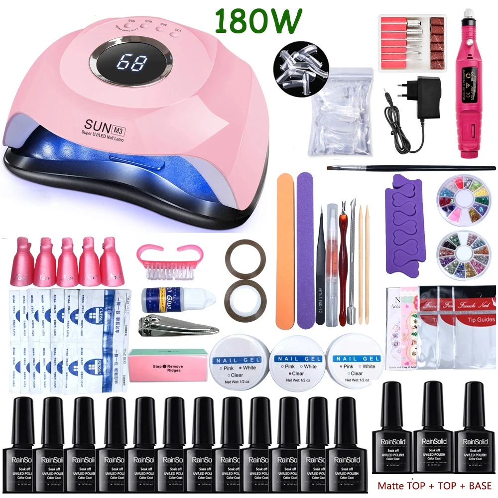 Полный набор гелевых ногтей маникюрный набор с 180 Вт УФ светодиодный набор ламп для ногтей 12 шт. Гель-лак для ногтей электрическая дрель для ногтей инструмент для салона