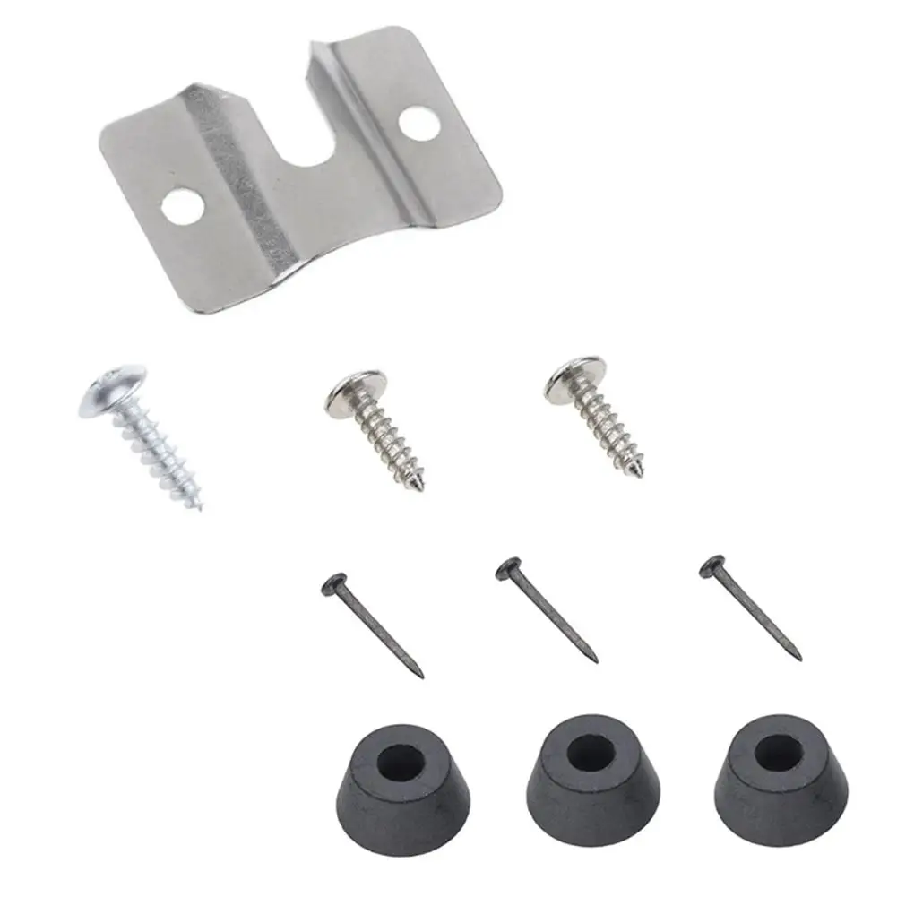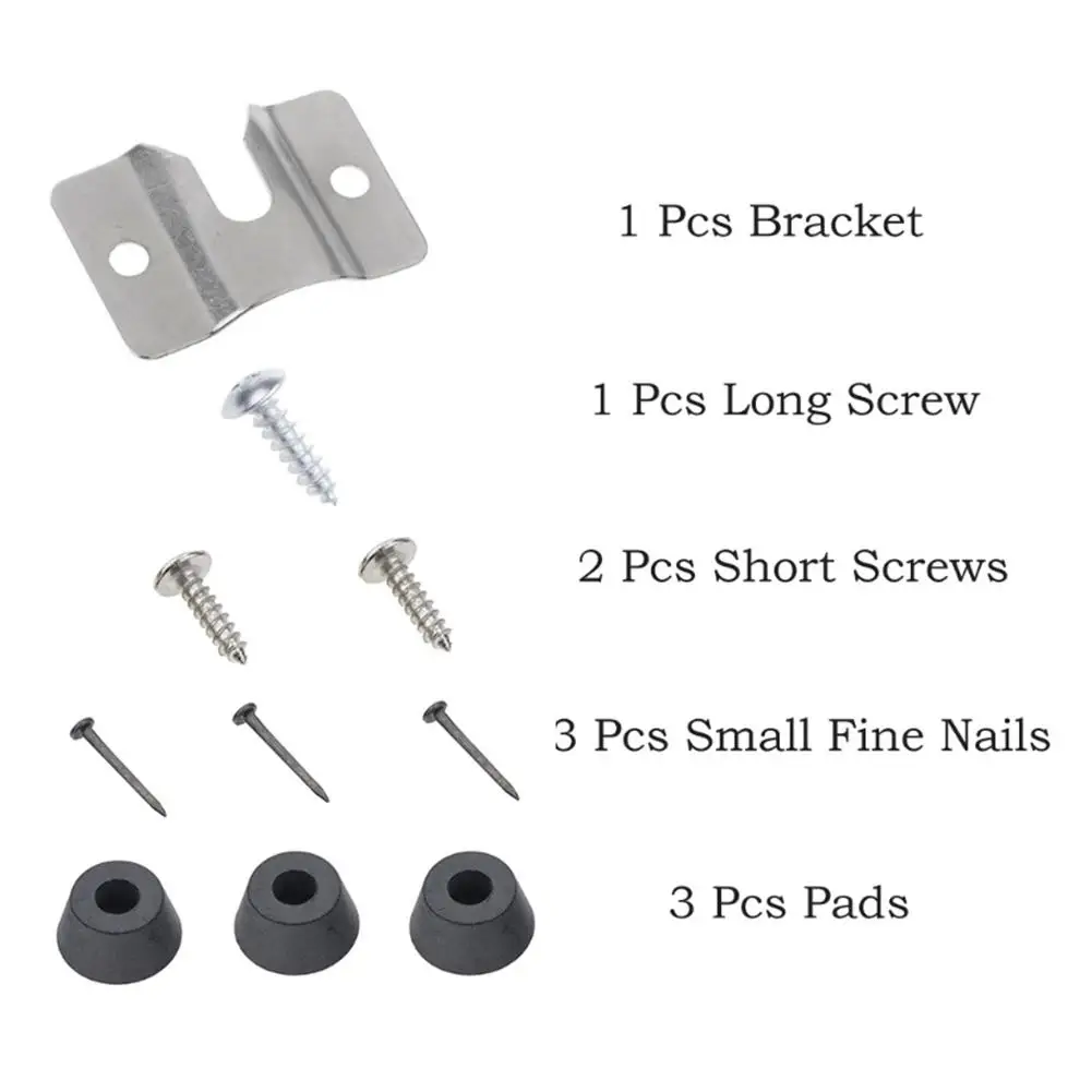 Характеристики:Упаковка: OPP мешокВес: около 0,016 кгРазмер упаковки: около 10x6x 1 см/3,94*2,36 * 0.39inУпаковочный лист:Кронштейн x 1Длинный Винт x 1Короткий винт x 2Колодки x 3Маленький черный Гвоздь x 3