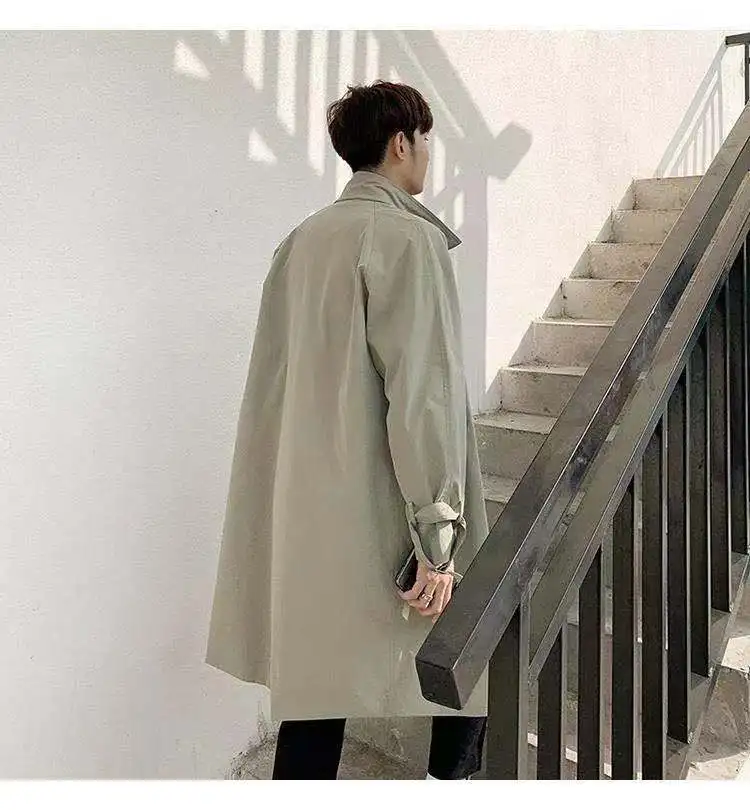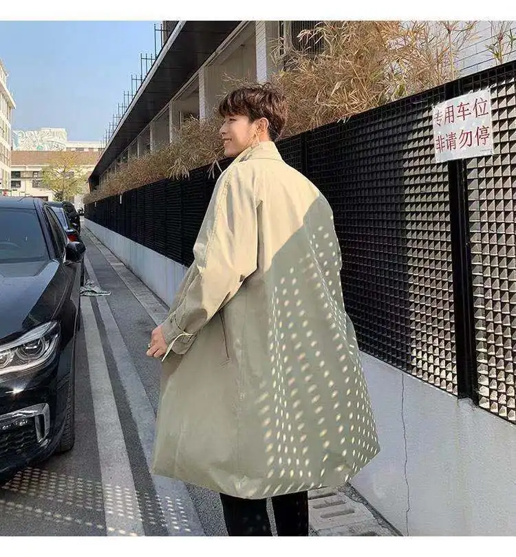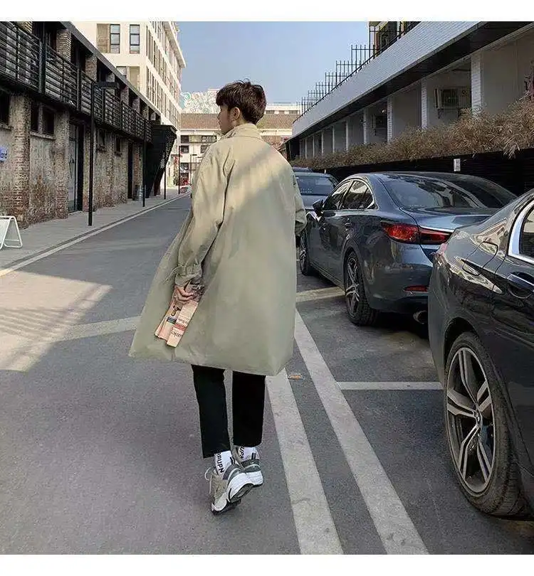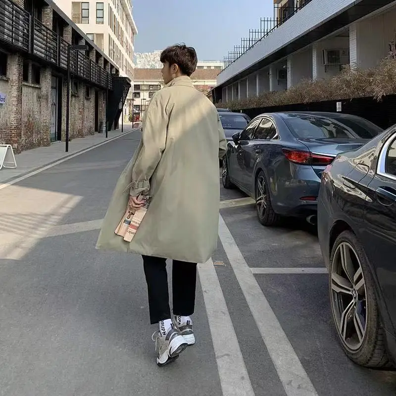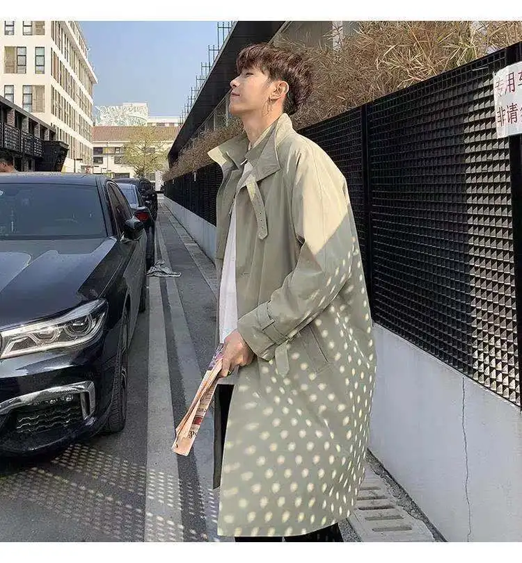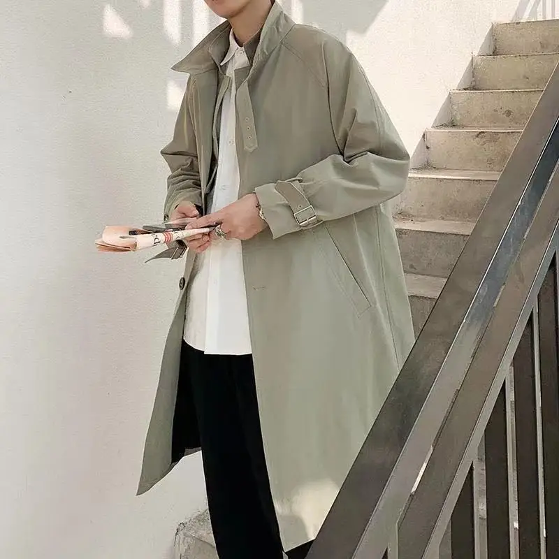 Мужская куртка-бомбер средней длины, модная трендовая верхняя одежда в Корейском стиле, свободные пальто с воротником, зеленыйчерный Тренч, свободная ветровка, 2021