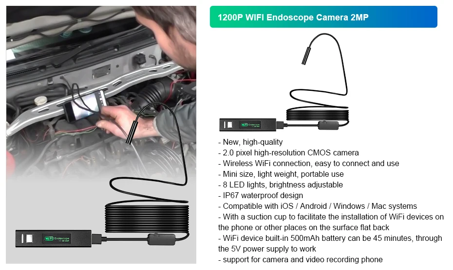1200P WIFI эндоскоп камера 2MP Мини водонепроницаемая Инспекционная камера 8 мм USB бороскоп эндоскоп для автомобилей Android IOS