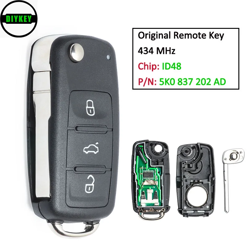 Оригинальный флип-накопитель DIYKEY с 3 кнопками 434 МГц ID48 для VW Volkswagen Toureg Beetle Golf Jetta 5K0 837 202 AD