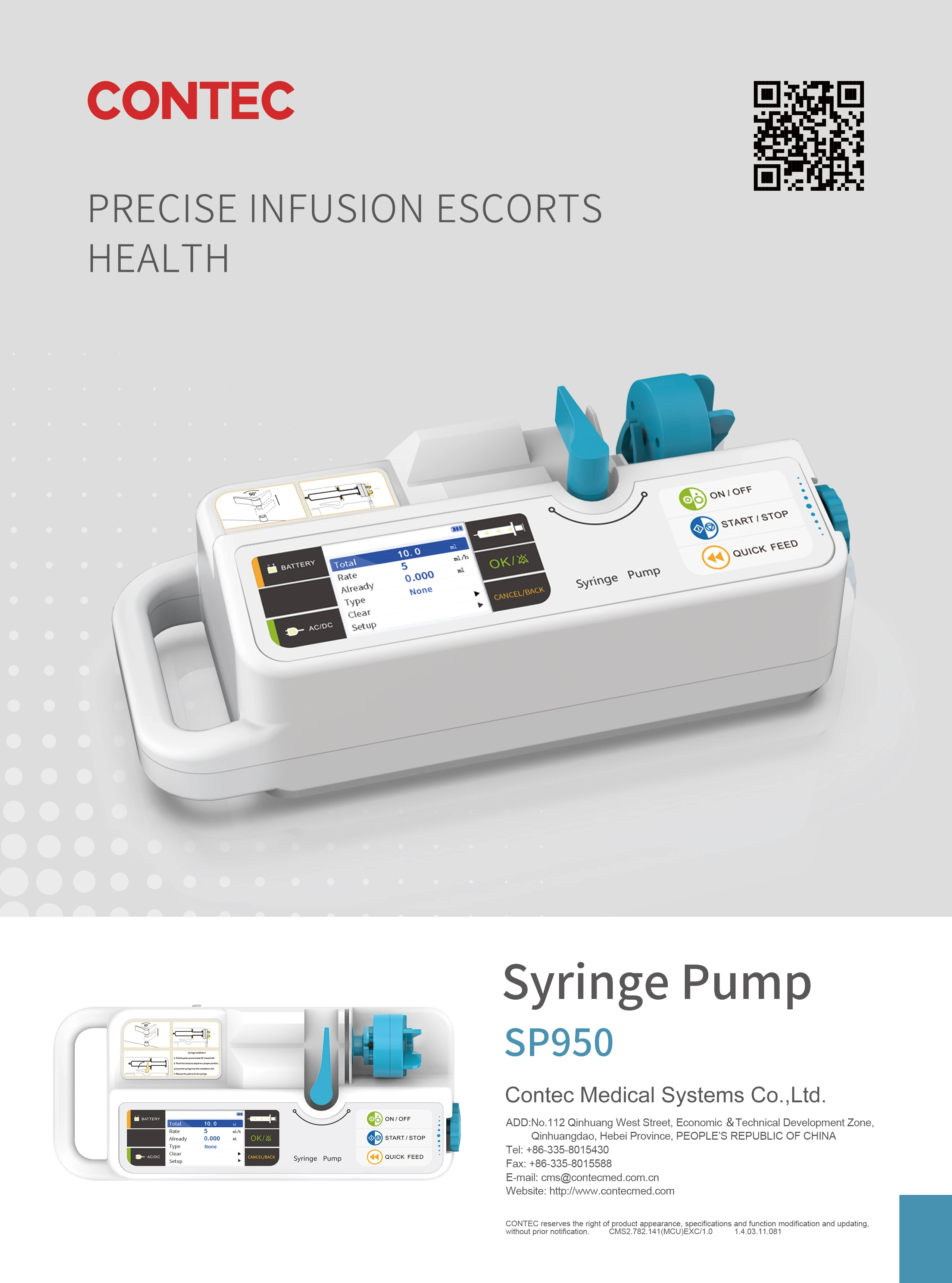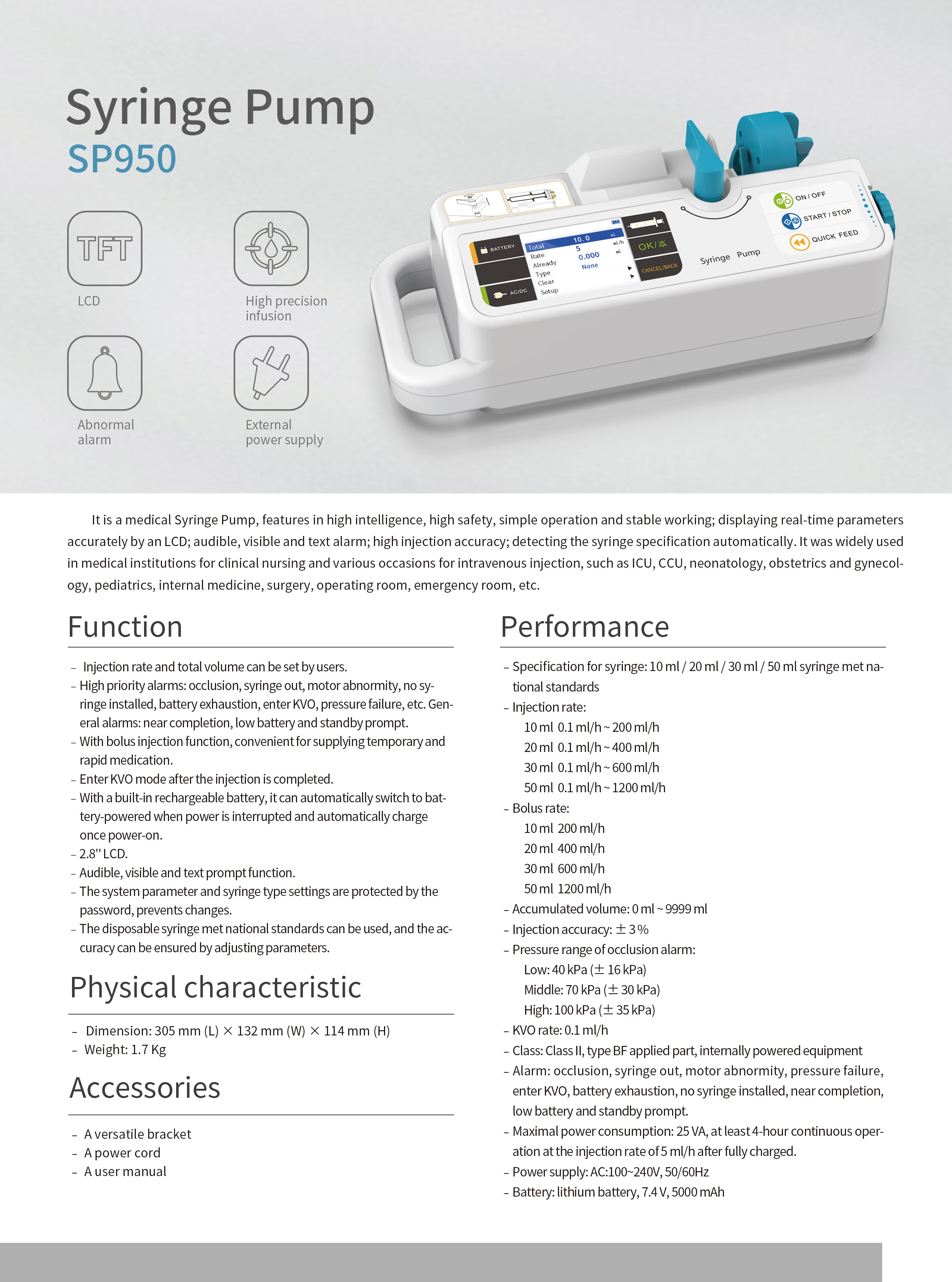 SP950 является шприц-насосом для медицинского использования, и он принимает микрокомпьютерную систему и микроэлектронные технологии, особенности в высоком интеллекте и высокой безопасности. ЖК-дисплей может отображать каждый параметр в режиме реального времени, с многофункциональной сигнализацией и сигналом с визуальной, слуховой и символьной подсказкой. Он принимает преимущества легкой эксплуатации, стабильной работы, высокой точности и автоматической проверки спецификации шприца. И теперь, он широко применяется в каждой впрыске вены в больницах для клинического ухода, таких как ICU, CCU, Неонатология, Акушерство и гинекология, педиатрия, Внутренняя медицина, хирургии, операционной, комната скорой помощи.