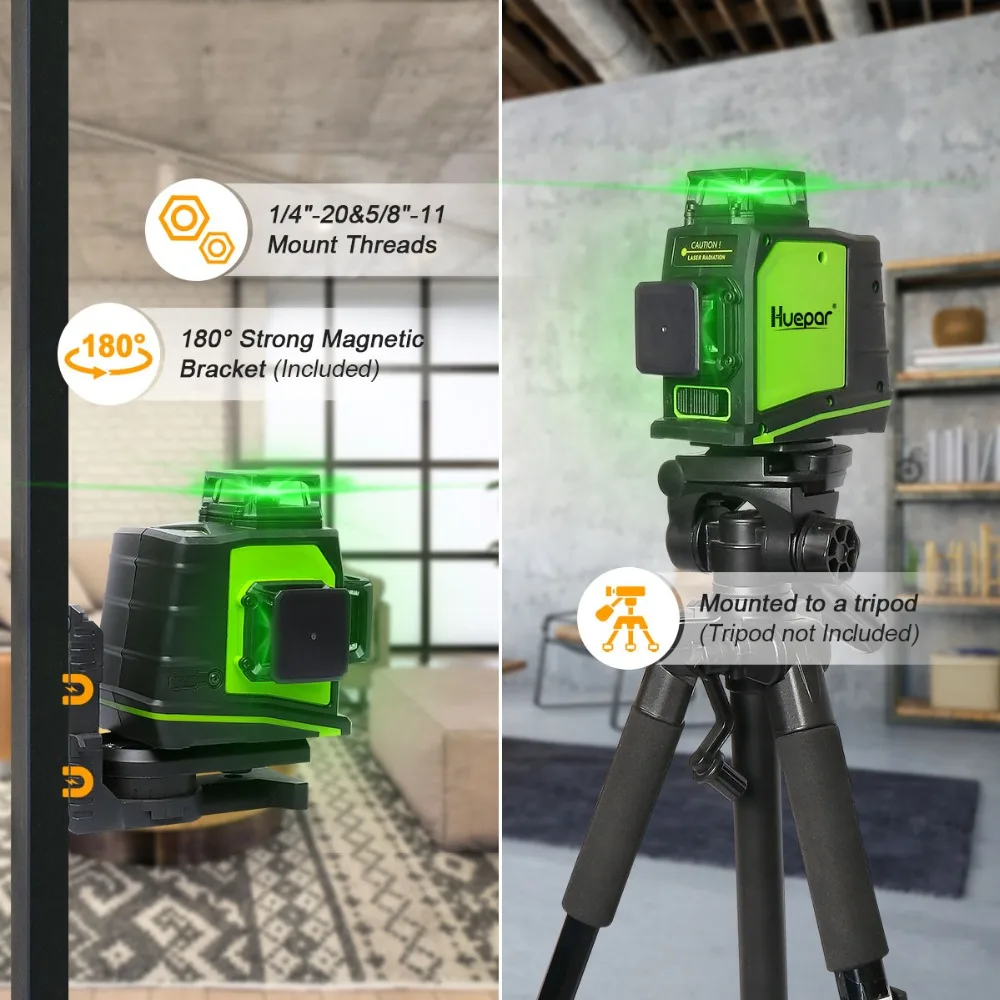 Этот лазерный уровень выдерживает магнитное крепление на 180 ° с резьбой штатива 5/8-11 дюймов и 1/4-20 дюймов, которое имеет сильные магниты, чтобы прикрепить к стальным шпилькам, удобно поворачивать его на 180 градусов по горизонтали и фиксировать на штативе.