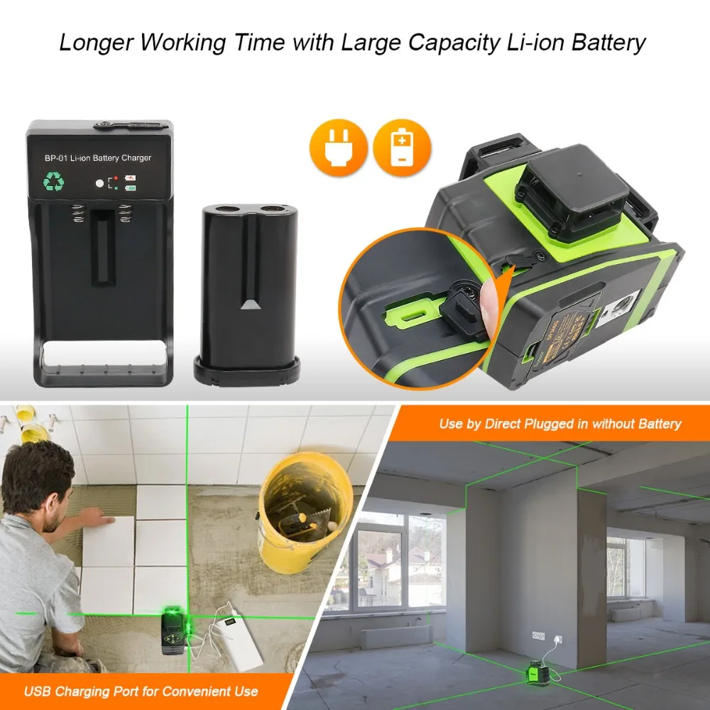 Инструмент уровня может быть использован на месте работы, byplugged в directlyдаже если вынуть батарею. Пользователи могут самостоятельно заряжать аккумулятор с помощью зарядного устройства. С usb-портом для зарядки лазерный уровень также может заряжаться телефоном, ноутбуком, зарядным устройством, автомобильным зарядным устройством и т. д. Этот лазерный уровень принимает литий-ионный аккумулятор rechargeablelarge.
