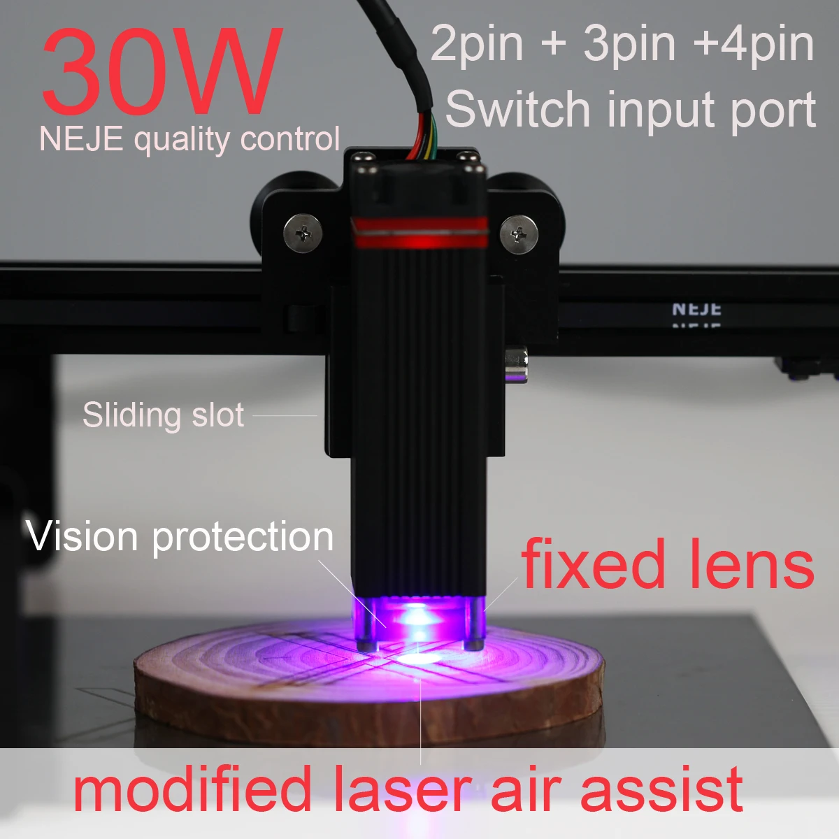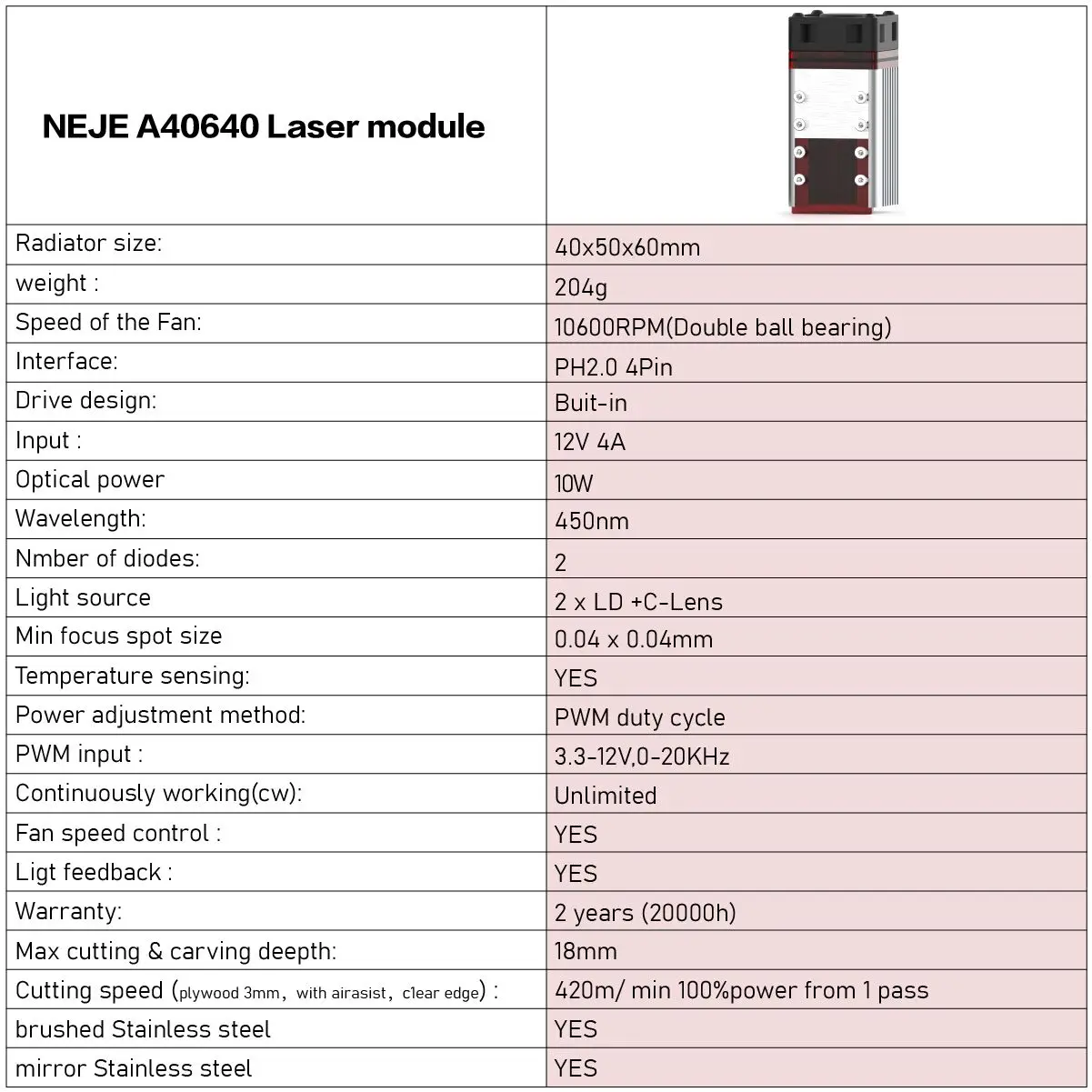 Общая Спецификация:Модель: NEJE ModuleМатериал радиатора: авиационный алюминий + латунный корпусСветящийся цвет: синийРазмер сечения: 40 мм x 40 ммРежим охлаждения: Интеллектуальный контроль датчика температуры + вентилятор охлаждения 10000 об/мин 40 ммРазмер: 60*40*40 ммРазъем адаптера: 5,5 2,1 портГравировка: МДФ/балса/бумага/дерево/ткань/пластик/кожа/Фанера/пенная бумага/анодированный алюминий/нержавеющая стальТехнические параметры:Оптическая Выходная мощность: 5,5 W/FAC 5,5 Вт/10 ВтДлина волны: 455-450нмФорма луча: точка (фокусируемая)Рабочее напряжение: 12 В постоянного токаМодуляция TTL и PWM: Да, Совместимость с модуляцией TTL и PWMВходное напряжение: DC12V 4APWM/TTL Вход: DC3.3V-12VВходной интерфейс: PH2.0-4Pin (+,-, ШИМ/TTL, температура), 3Pin (+,-, ШИМ/TTL) , 2Pin + 2Pin (+,-) + (ШИМ/TTL,-)Примечание: Температурный интерфейс может быть отключен, NEJE предоставляет текстовые инструкции по приобретению температуры на wiki.Режим привода: внешний ACCБезопасный диапазон температур:<60 ℃Вес модуля: 202 г (чем легче вес, тем меньше инерция движения, тем лучше производительность)Срок службы: 10000-20000 часов