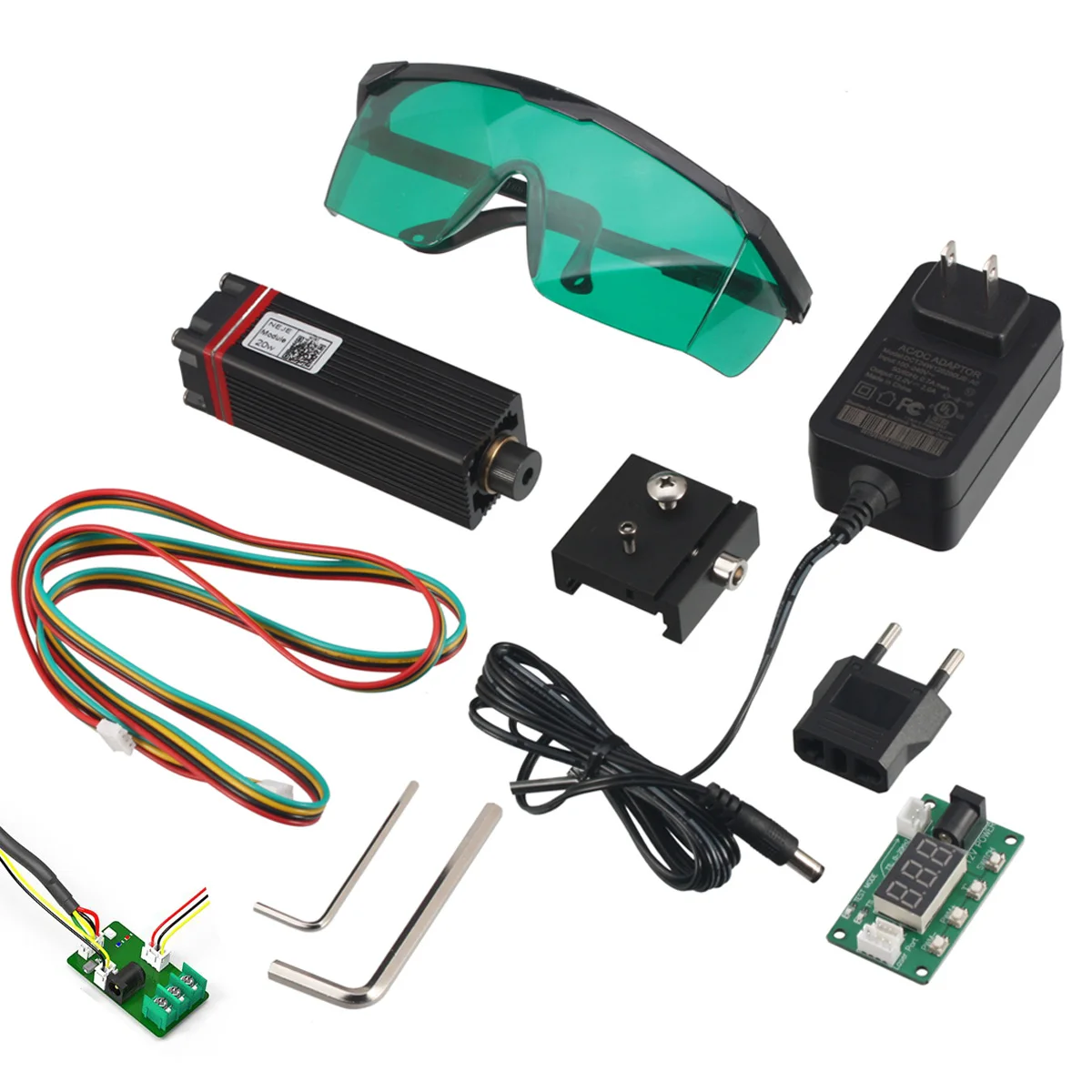 1 x Лазерный Гравировальный модуль N308201 x лазерный модуль раздвижной арматуры1 x 4-контактный кабель (1000 мм)1 x NEJE PWM/плата для измерения температуры1x110V-240V 12V2A UL сертифицированный источник питания1 х Евро адаптер1x2,5 мм Г-образный ключ, дюймовый стандарт1 х 5 мм l-образный ключ1 x очки