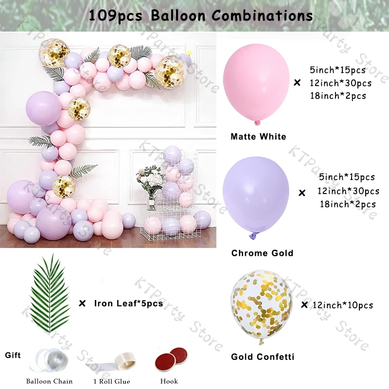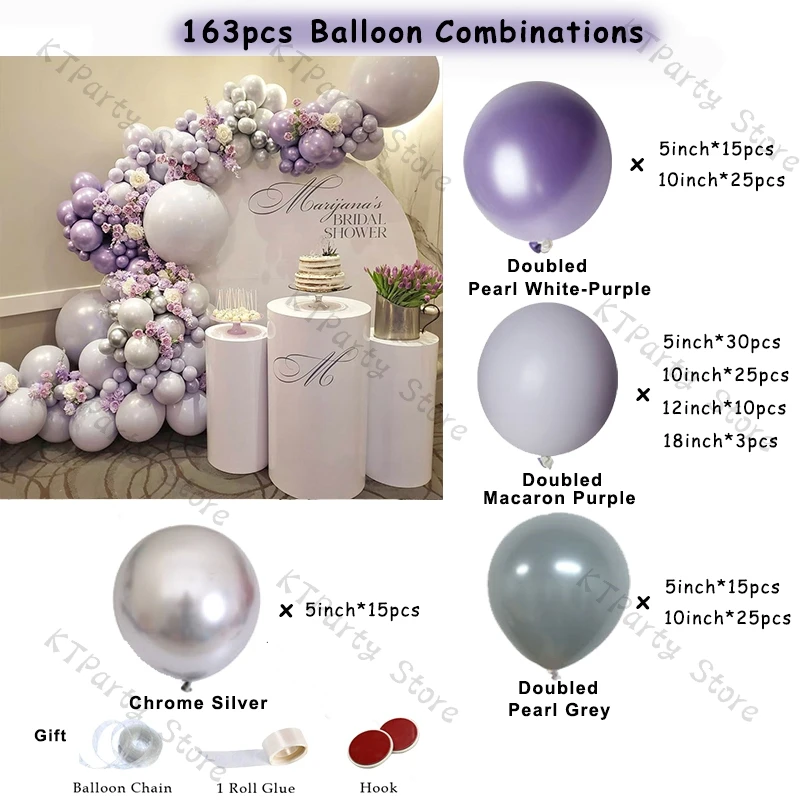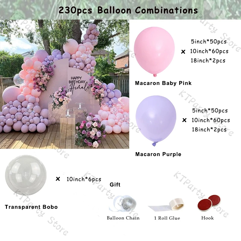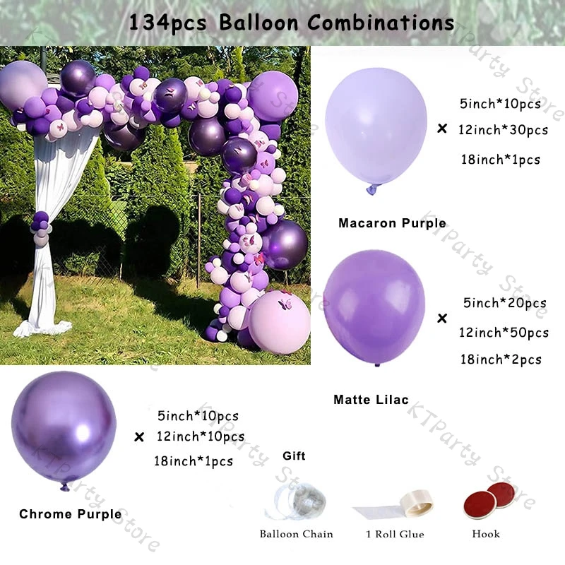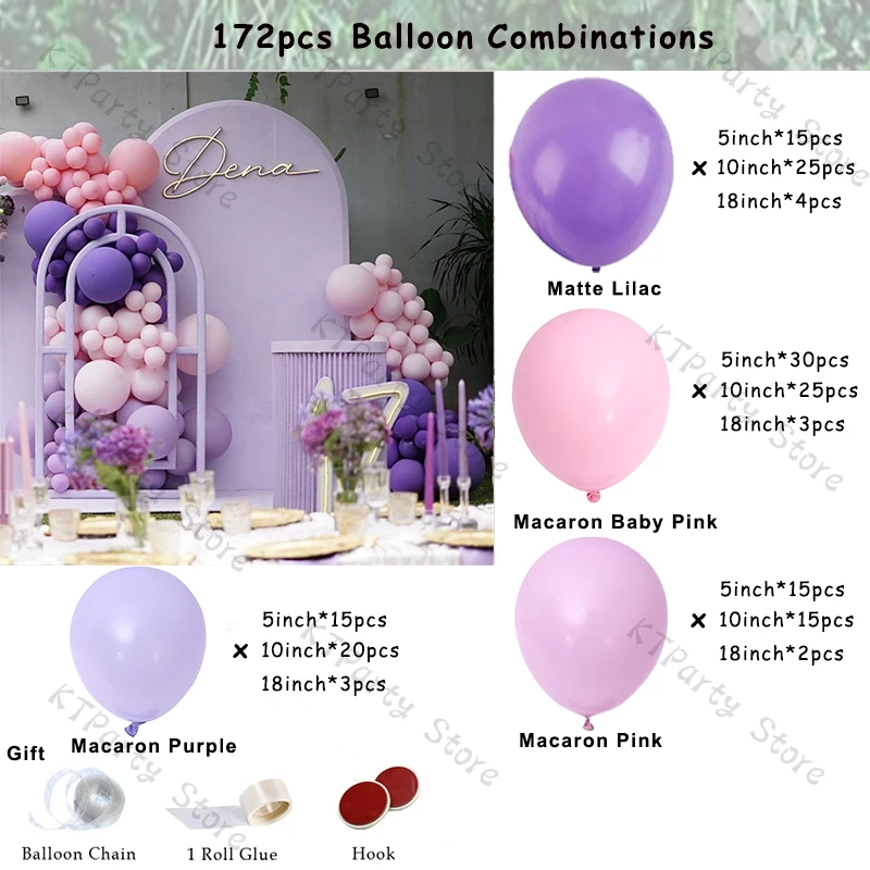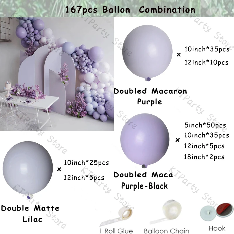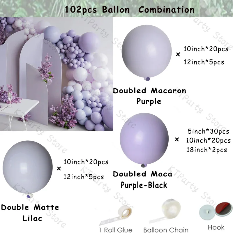 Фиолетовый макарон в два раза (10 дюймов * 35 шт., 12 дюймов * 10 шт.)Двойные Maca фиолетово-черные (5 дюймов * 30 шт., 10 дюймов * 35 шт., 12 дюймов * 5 шт., 18 дюймов * 2 шт.)Двойной матовый сиреневый (10 дюймов * 25 шт., 12 дюймов * 5 шт.)Бесплатно: рулонный клей * 1(100 шт)Воздушная цепь * 1(5 м)Крючок * 3