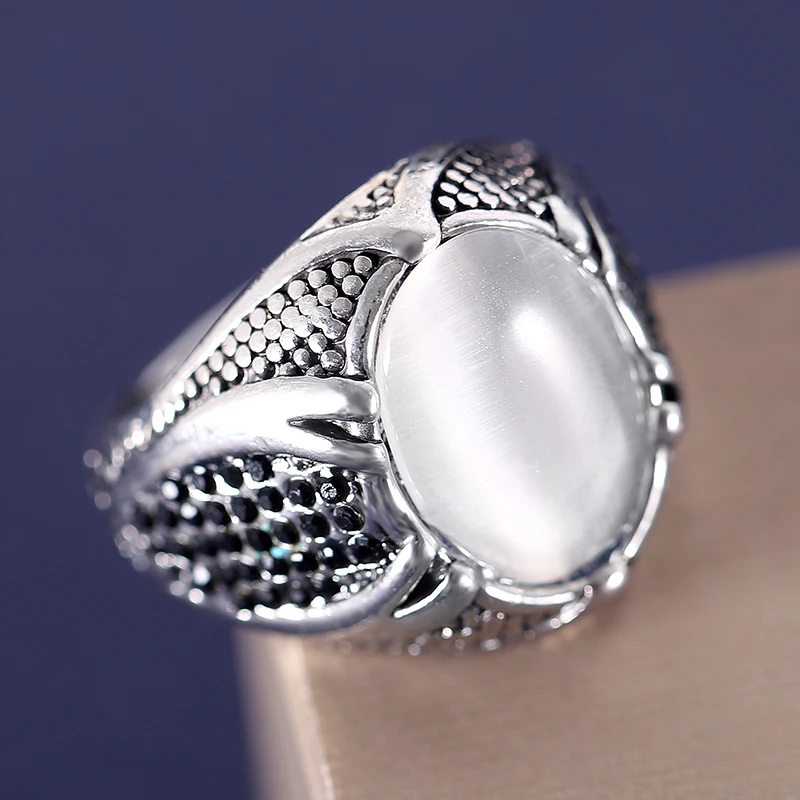Мусульманское кольцо из серебра 925 пробы с натуральным белым агатом и черным фианитом