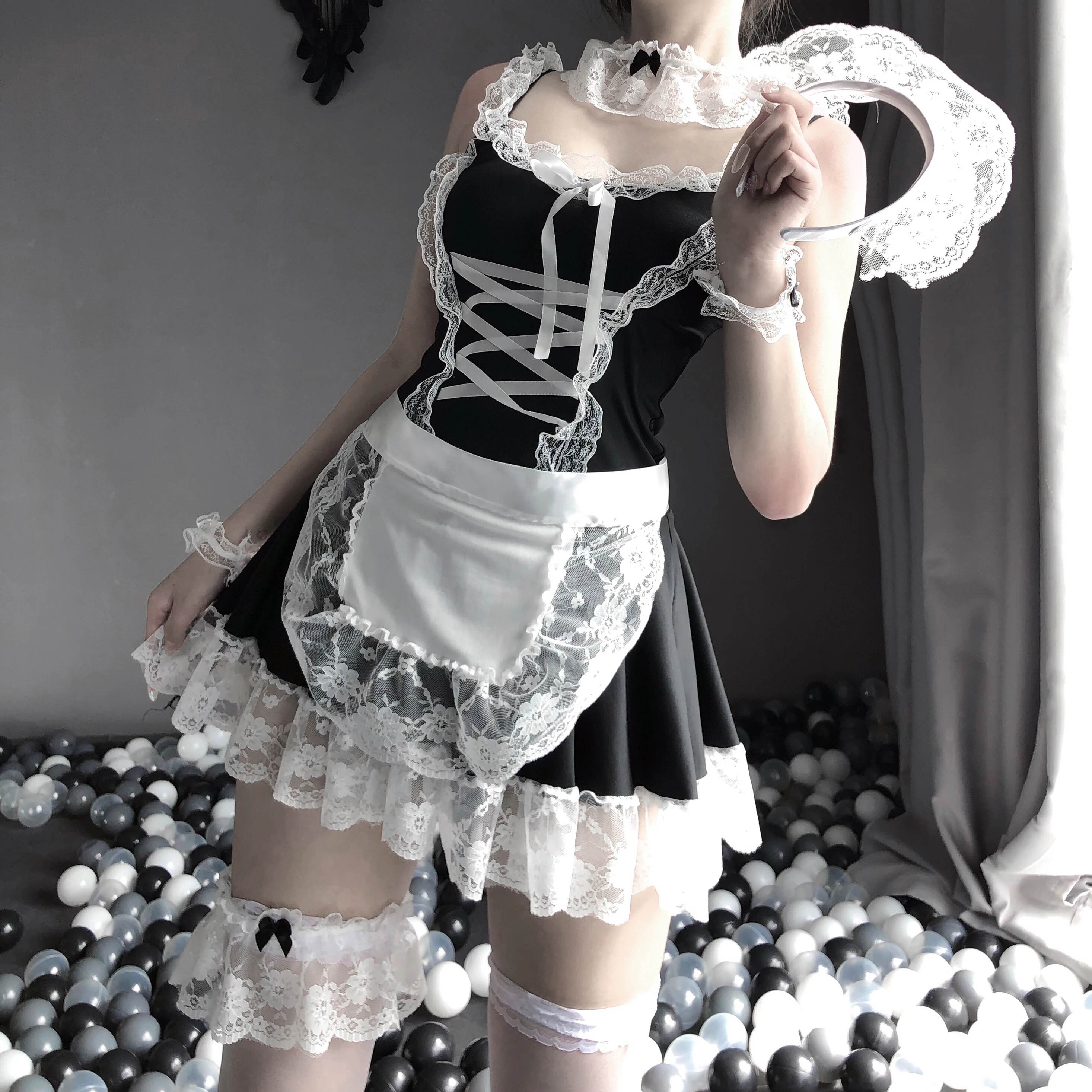 Сексуальное нижнее белье, эротическая одежда горничной, Униформа горничной, косплей, кружевная Пижама с глубоким V-образным вырезом, костюм, соблазнительная полуночная сорочка для женщин