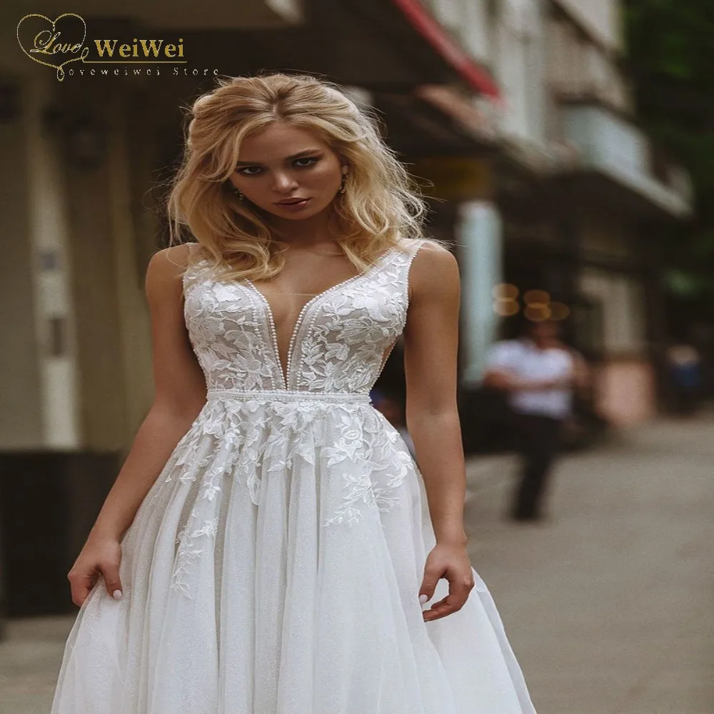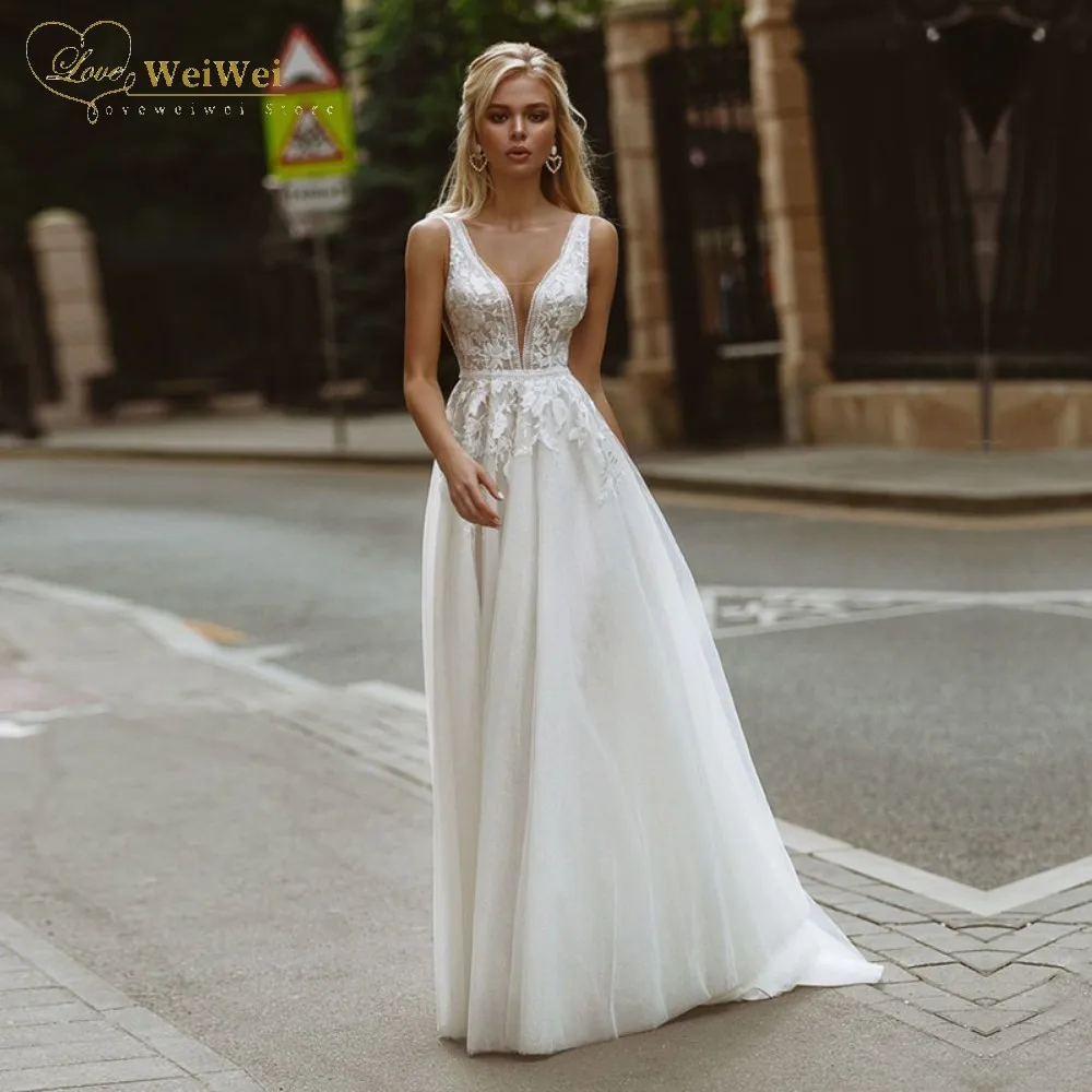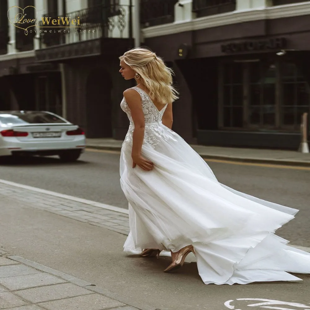 Элегантные богемные Свадебные платья а-силуэта с глубоким V-образным вырезом, со шлейфом, без рукавов, с завязками на спине и пуговицами, с аппликацией и поясом