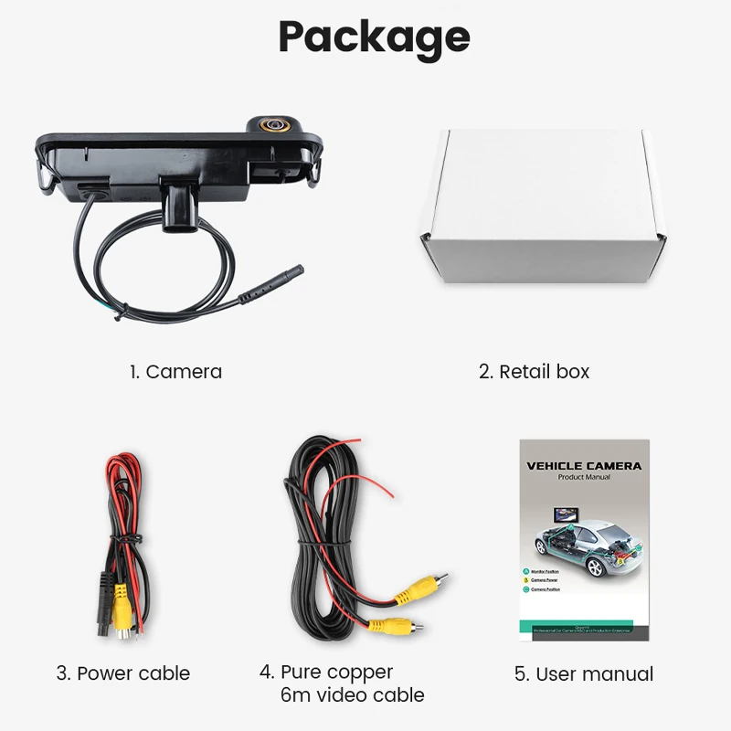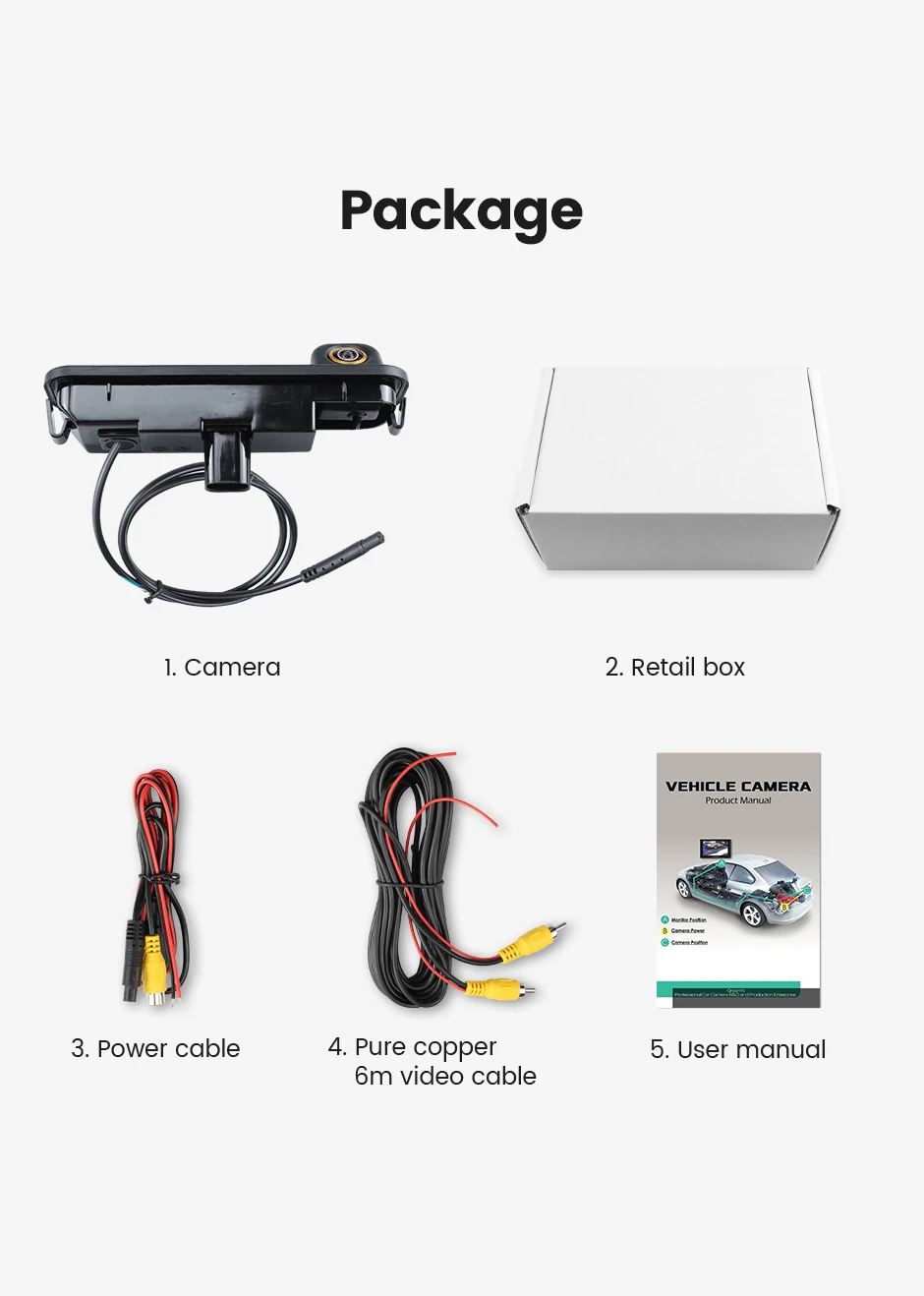 1. Камера заднего вида2. Розничная коробка3. Кабель питания4. Чистый медный 6 м видео кабель5. Руководство пользователя