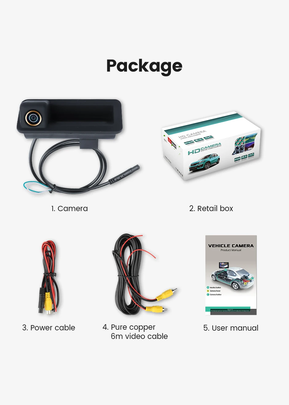 1. Камера заднего вида 2. Розничная коробка 3. Кабель питания 4. Чистый медный 6 м видео кабель 5. Руководство пользователя