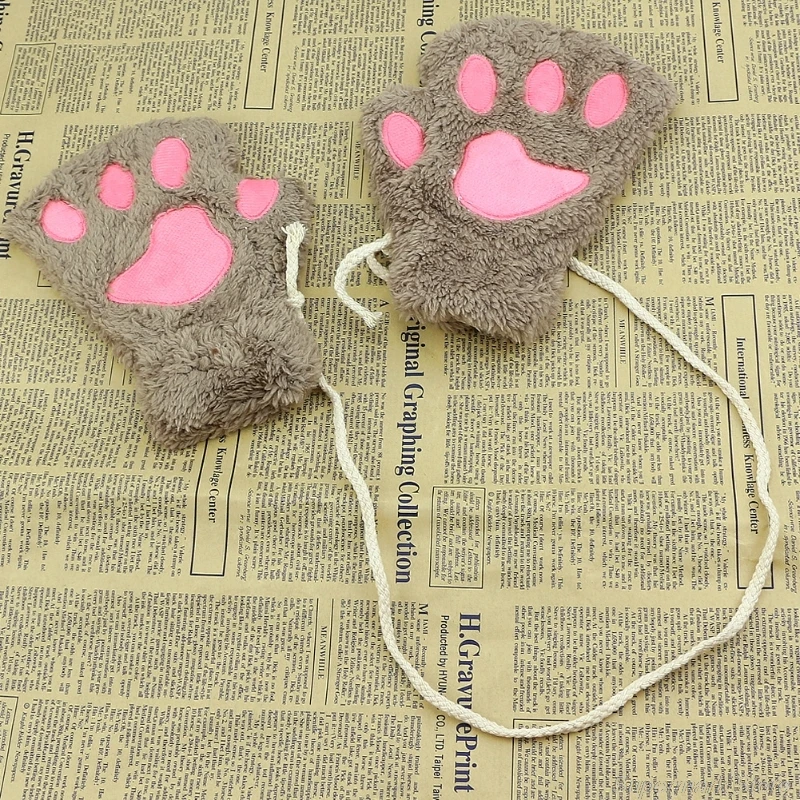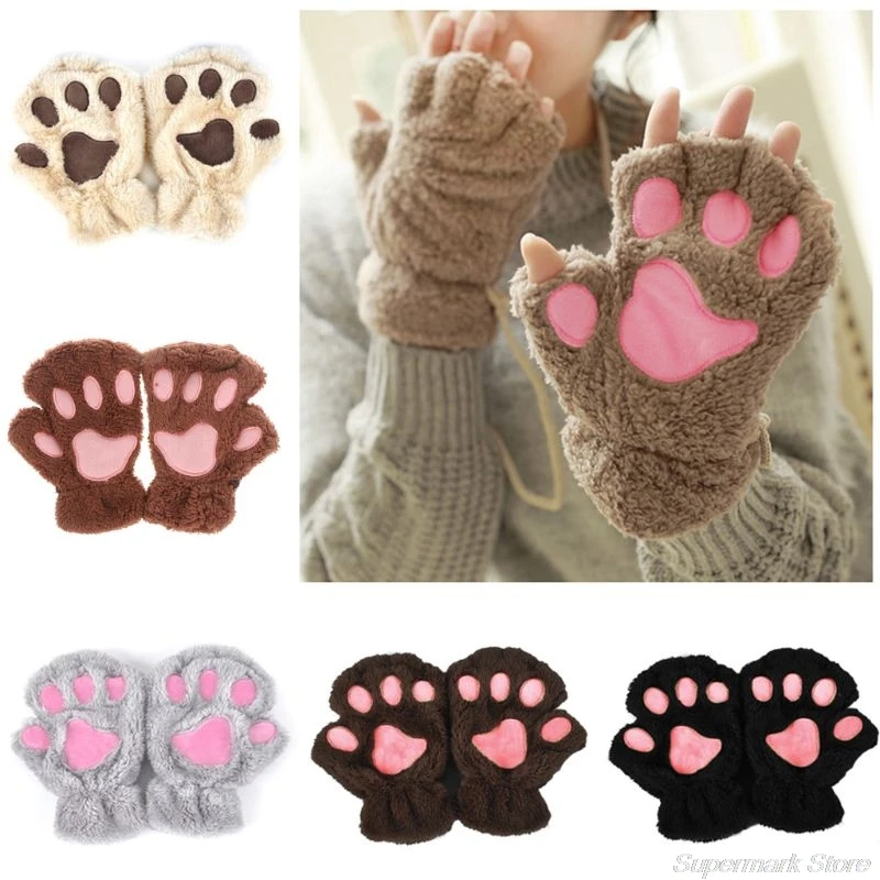 Зимние женские Симпатичные плюшевые варежки с кошачьими лапами и когтями, Короткие перчатки с открытыми пальцами