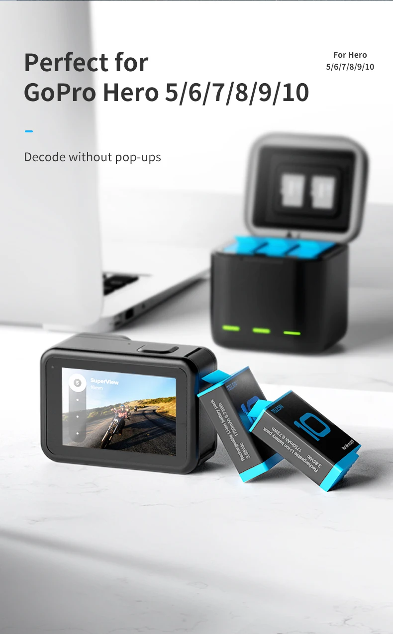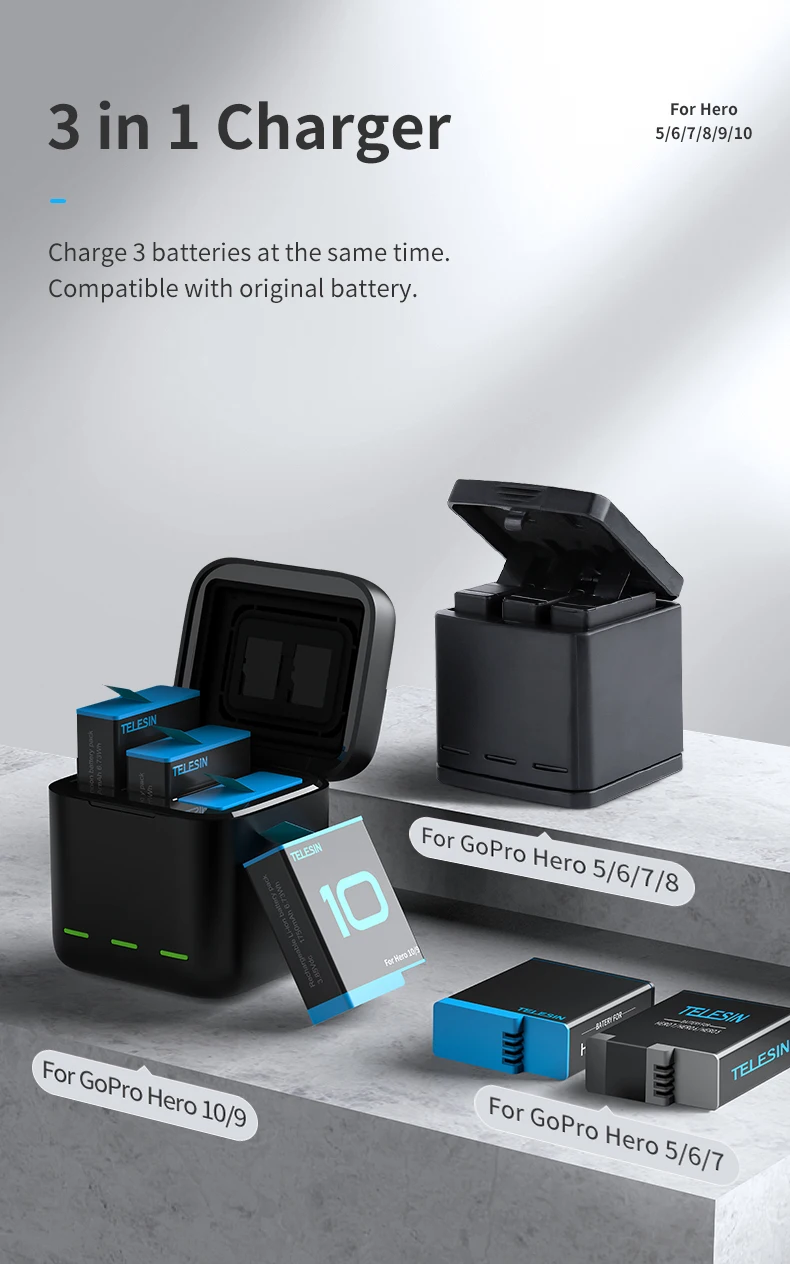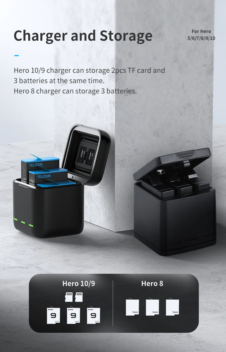 Аккумуляторная батарея TELESIN для GoPro Hero 10, 9, 8, 7, 6, 5, 3 способа, светодиодсветильник ка, зарядное устройство с TF-картой, зарядное устройство для Hero 5, 6, 7, 8, 9, 10, Черная