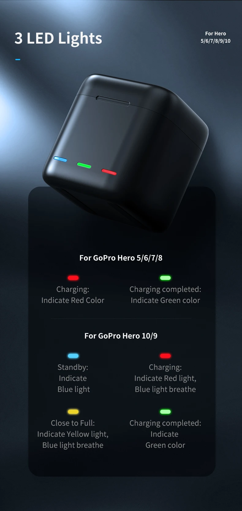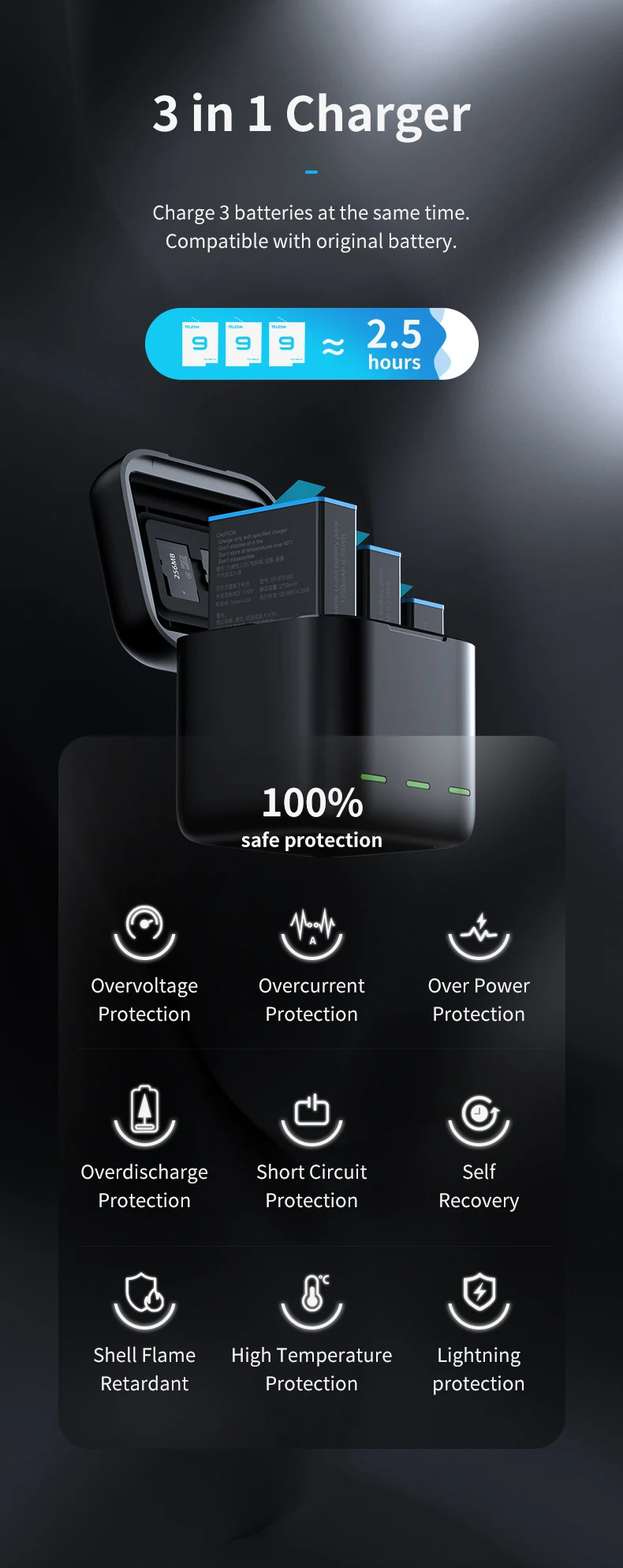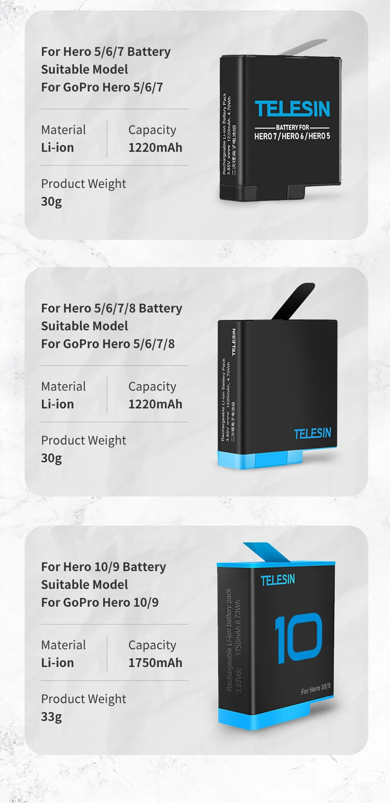 Аккумуляторная батарея TELESIN для GoPro Hero 10, 9, 8, 7, 6, 5, 3 способа, светодиодсветильник ка, зарядное устройство с TF-картой, зарядное устройство для Hero 5, 6, 7, 8, 9, 10, Черная