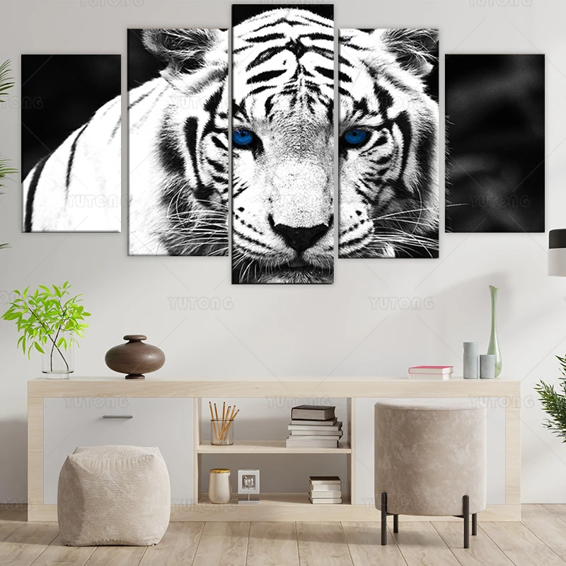 Модульная Картина на холсте, 5 панелей, белая, картины тигра, для гостиной, печать, украшение, плакат, картина в рамке