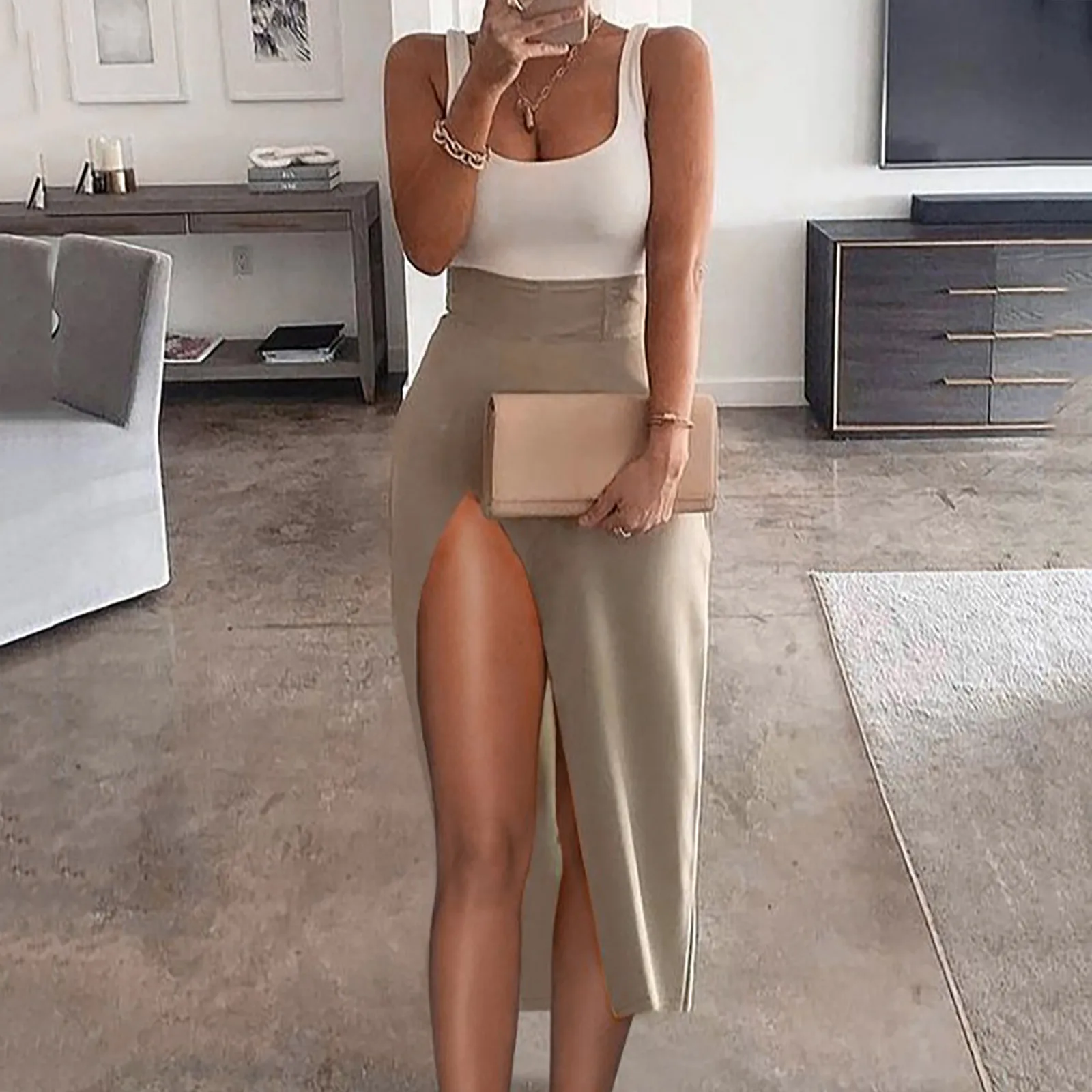 Женское длинное платье без рукавов, повседневное однотонное платье с высокой талией и разрезом, лето 2021