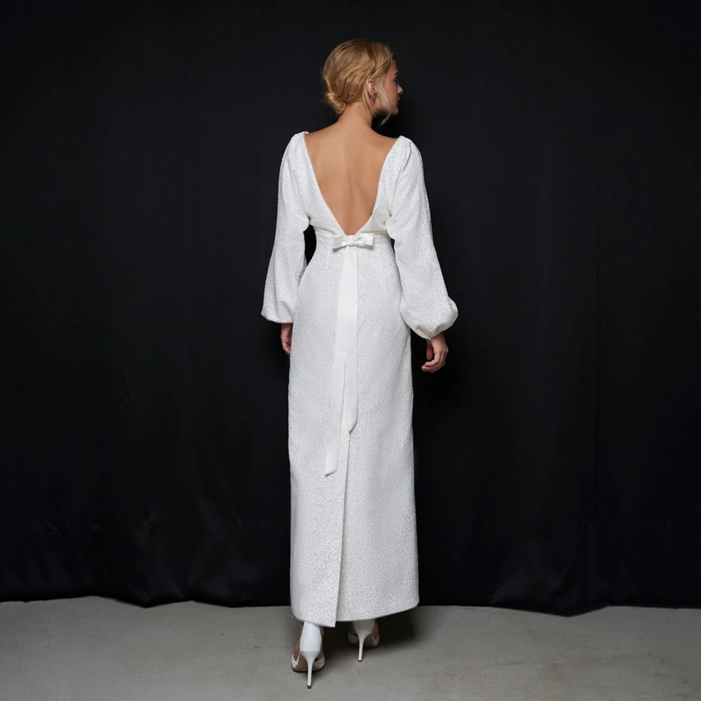 Женское блестящее свадебное платье с v-образным вырезом, длинными пышными рукавами и открытой спиной, Vestido De Noche