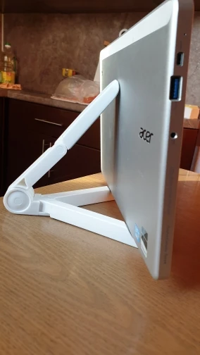 Всем доброе время суток! Брал для acer w700. Планшет 11,6 " дюймов. В подставке стоит уверенно. Единственный минус - из за не ровной нижней плоскости подставки она шатается. Под заднию опору надо будет что-то наклеивать (пример фото). Ну за такую цену не грех и допилить. Упаковка стандартная - пакет/пупырка. Посылка стартанула быстро, но на границе висела неделю.