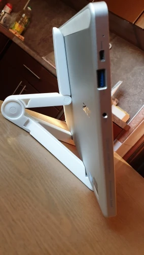 Хорошая удобная подставка. Однако у моей плохо подогнана правая ножка - она болтается, ее нельзя закрепить так как левую, за это снизила оценку. планшет стоит на ней очень хорошо, даже вертикально на мягкой кровати. По доставке нет претензий, пришло очень быстро.