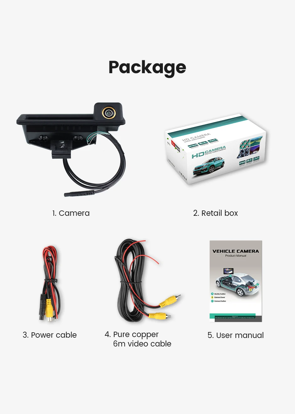 1. Камера заднего вида2. Розничная коробка3. Кабель питания4. Чистый медный 6 м видео кабель5. Руководство пользователя