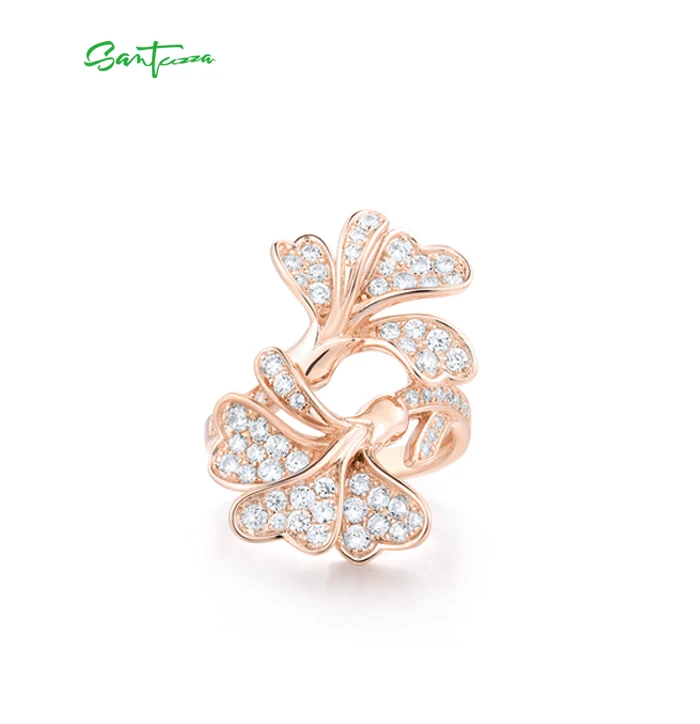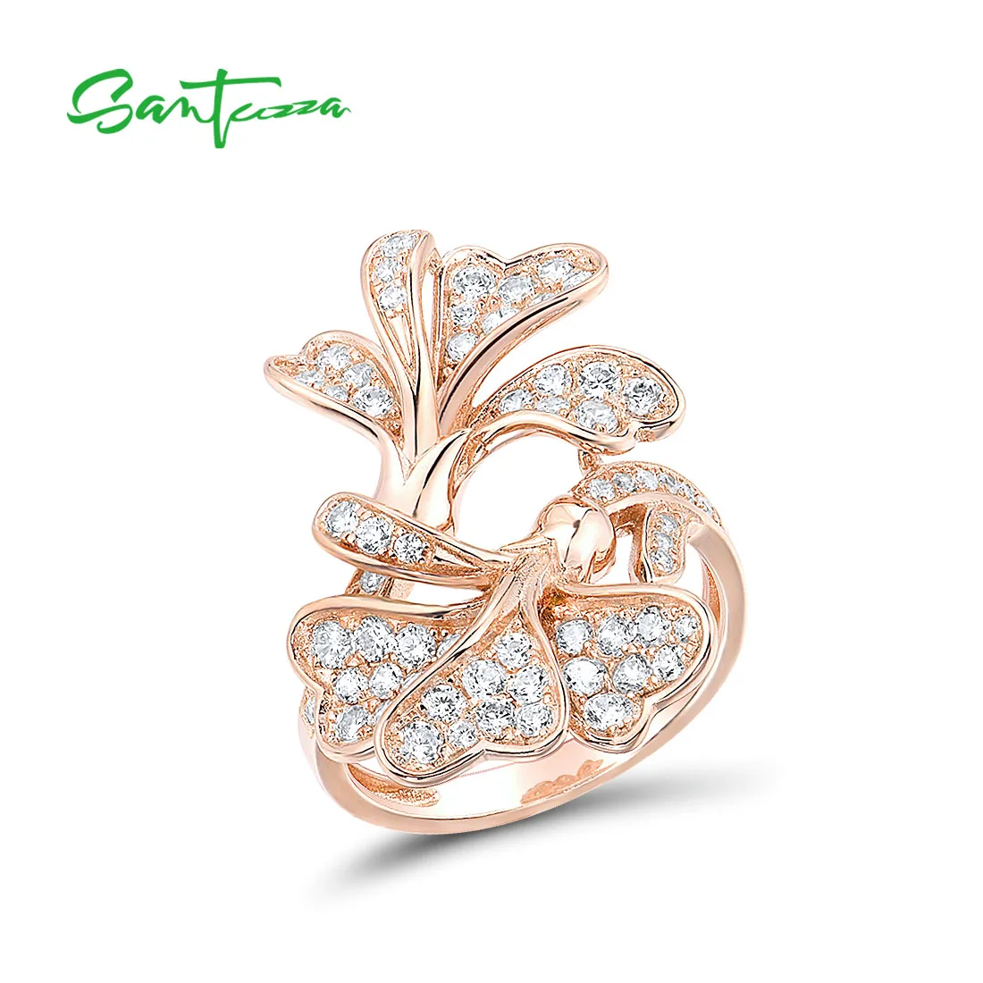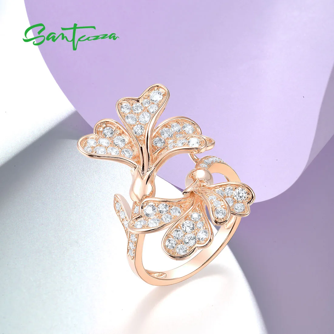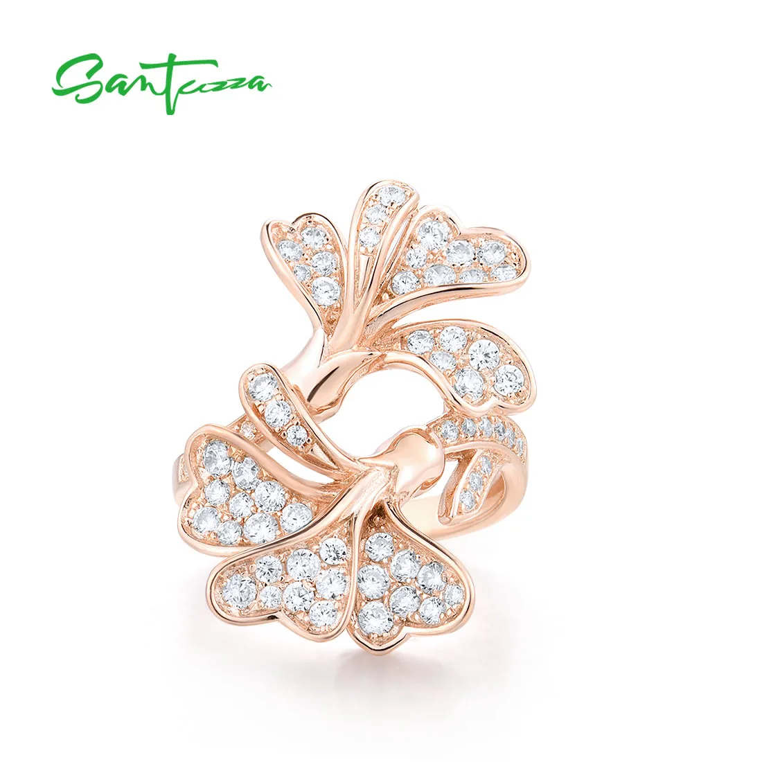 Женское серебряное кольцо SANTUZZA, из серебра 925 пробы с белым кубическим цирконием, с цветком розового золота, модные ювелирные украшения