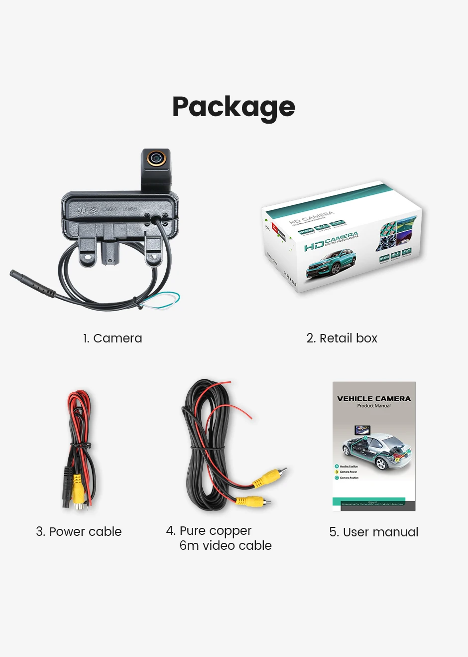 1. Камера заднего вида 2. Розничная коробка 3. Кабель питания 4. Чистый медный 6 м видео кабель 5. Руководство пользователя
