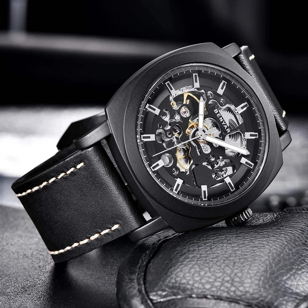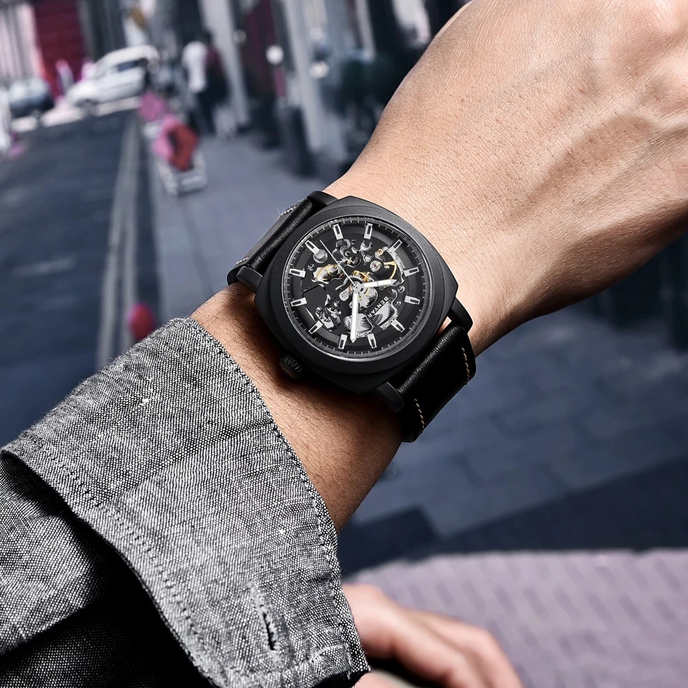 Мужские Водонепроницаемые механические часы с кожаным ремешком, в стиле милитари