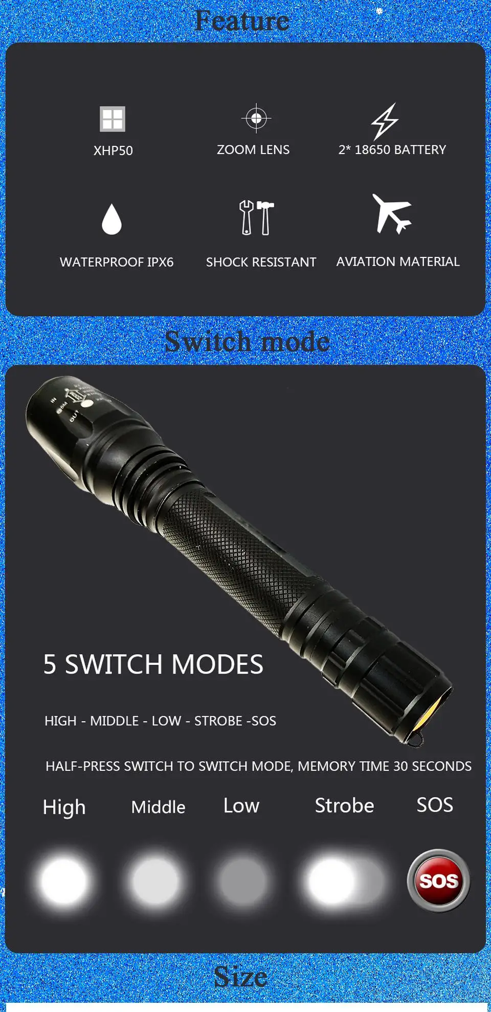 Switch mode5 Mode ( High - middel - low - strobe - SOS )