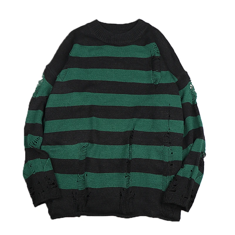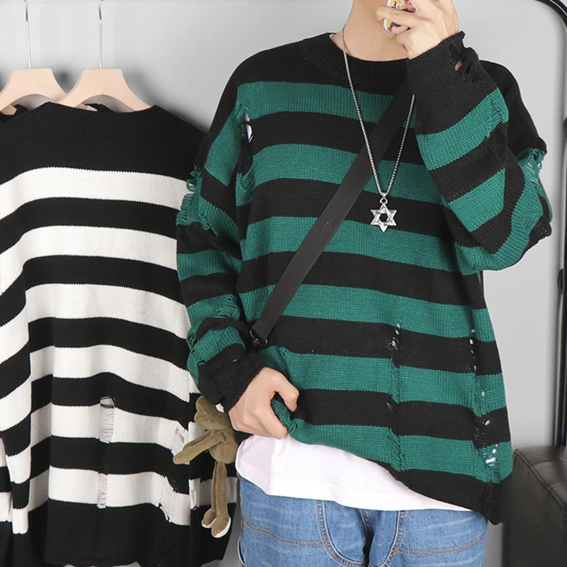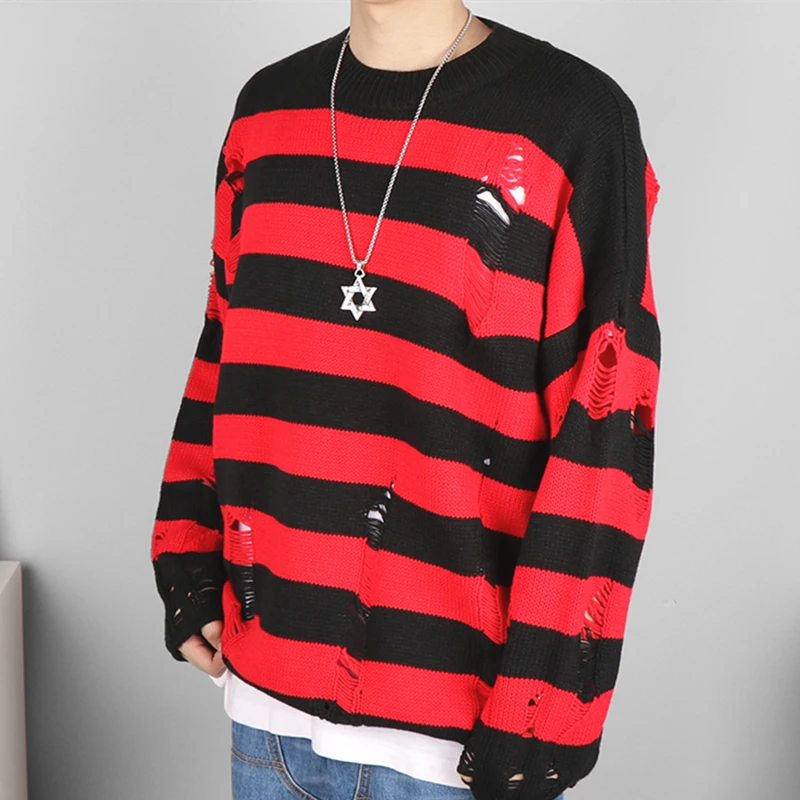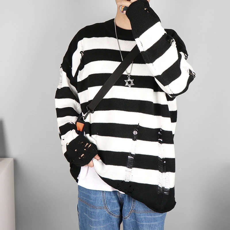 Мужские свитера в черную полоску, рваные свитера, пуловер с дырками...