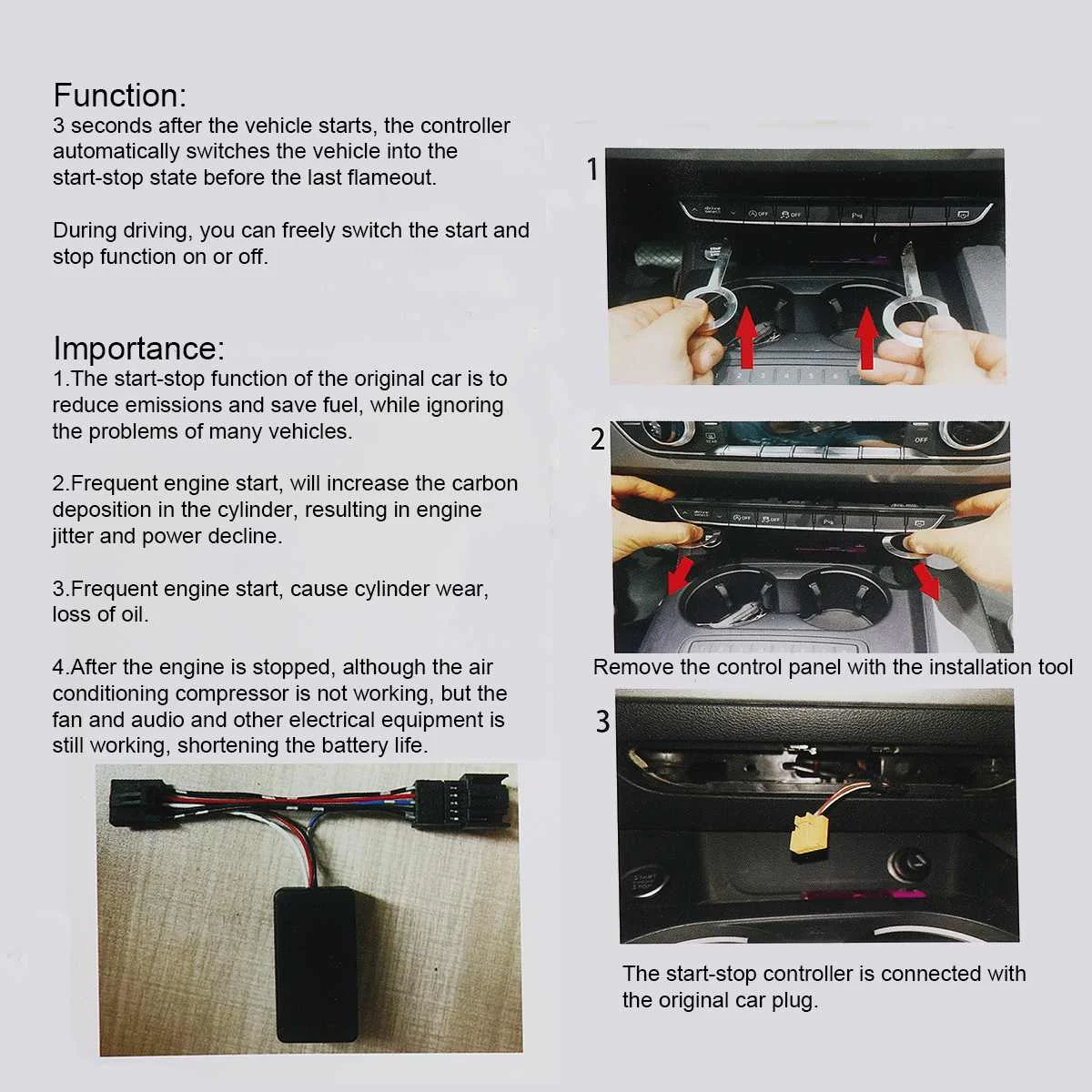 Смарт-программа отключения по умолчанию:* После установки при каждом зажигании автомобиля старт-стоп будет автоматически ВЫКЛЮЧАТЬСЯ.* После автоматического выключения можно активировать Пуск-стоп вручную.* После ручной активации, если в течение трех минут не будет ручного отключения, старт-стоп будет автоматически отключен.Установка:Для Audi A4/A5/S4/S5/RS4/RS5(B9) 2015-2020(Только для справки, пожалуйста, подтвердите, подходит ли товар вашему автомобилю перед покупкой.)Спецификация:Тип: внутренние молдингиМатериал: АБС-пластикДлина: 18,3 см/7,20 дюймаФункция: закройте двигатель с автоматической остановкой запускаКоличество: 1 шт. (инструменты для снятия входят в комплект)Особенности:-Во время вождения вы можете свободно включать или выключать функции запуска и остановки.-Использование интеллектуального чипа, без задержек, стабильный ток не вызовет ток из-за повреждения-Эффективно предотвращает повреждения двигателя, аккумулятора, свечи зажигания и т. д. из-за частого запуска.-Подключи и работай, проще установить. Настоятельно рекомендуется Профессиональная установка!Этапы установки:Найдите оригинальный интерфейс переключателя автомобильной вилки, и оригинальные кнопки запуска и остановки автомобиля могут быть переданы.Посылка1x ограничитель запуска двигателя (инструменты для снятия входят в комплект)Примечание:1. Инструкции в комплект не входят. Настоятельно рекомендуется Профессиональная установка!2. Возможны отклонения на 0,5-1 дюйм из-за ручного измерения.(1 дюйм = 2,54 см)3. Цвет изделия несколько отличается из-за разницы в мониторах.4.(ВАЖНО) инструкции в комплект не входят. Настоятельно рекомендуется Профессиональная установка!