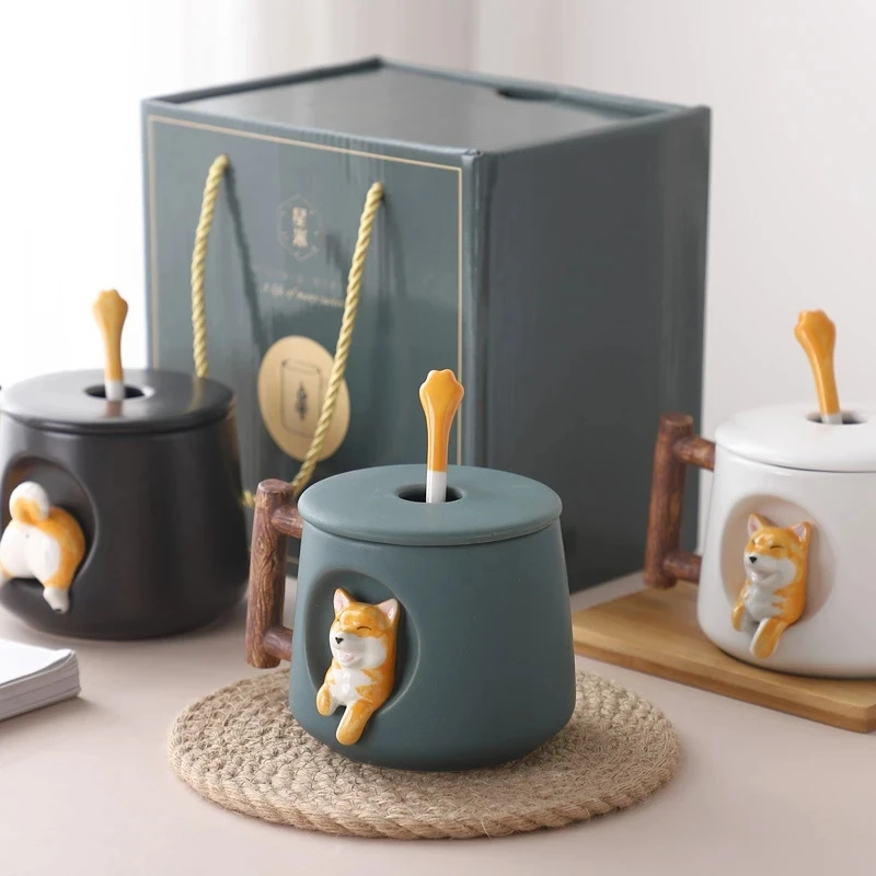 Kawaii керамическая кофейная кружка набор мультфильм 3D Шиба-ину собака рельефная монтируемая Персонализированная чашка для молока чая с крышкой ложкой рождественские подарки