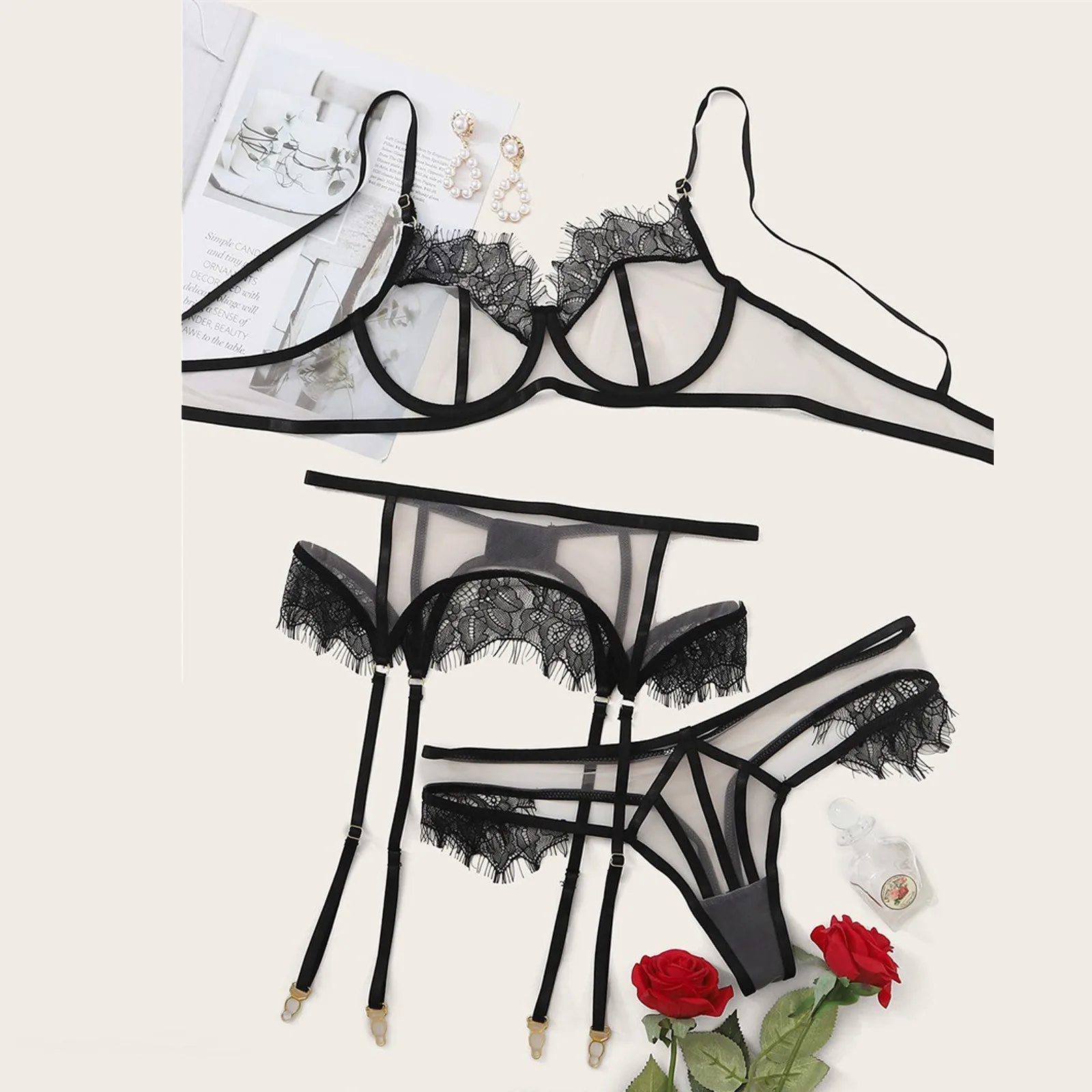 Эротическое женское нижнее белье, сексуальный однотонный прозрачный бюстгальтер без косточек, кружевные трусики, комплект нижнего белья из трех частей, женское внутреннее белье Е3
