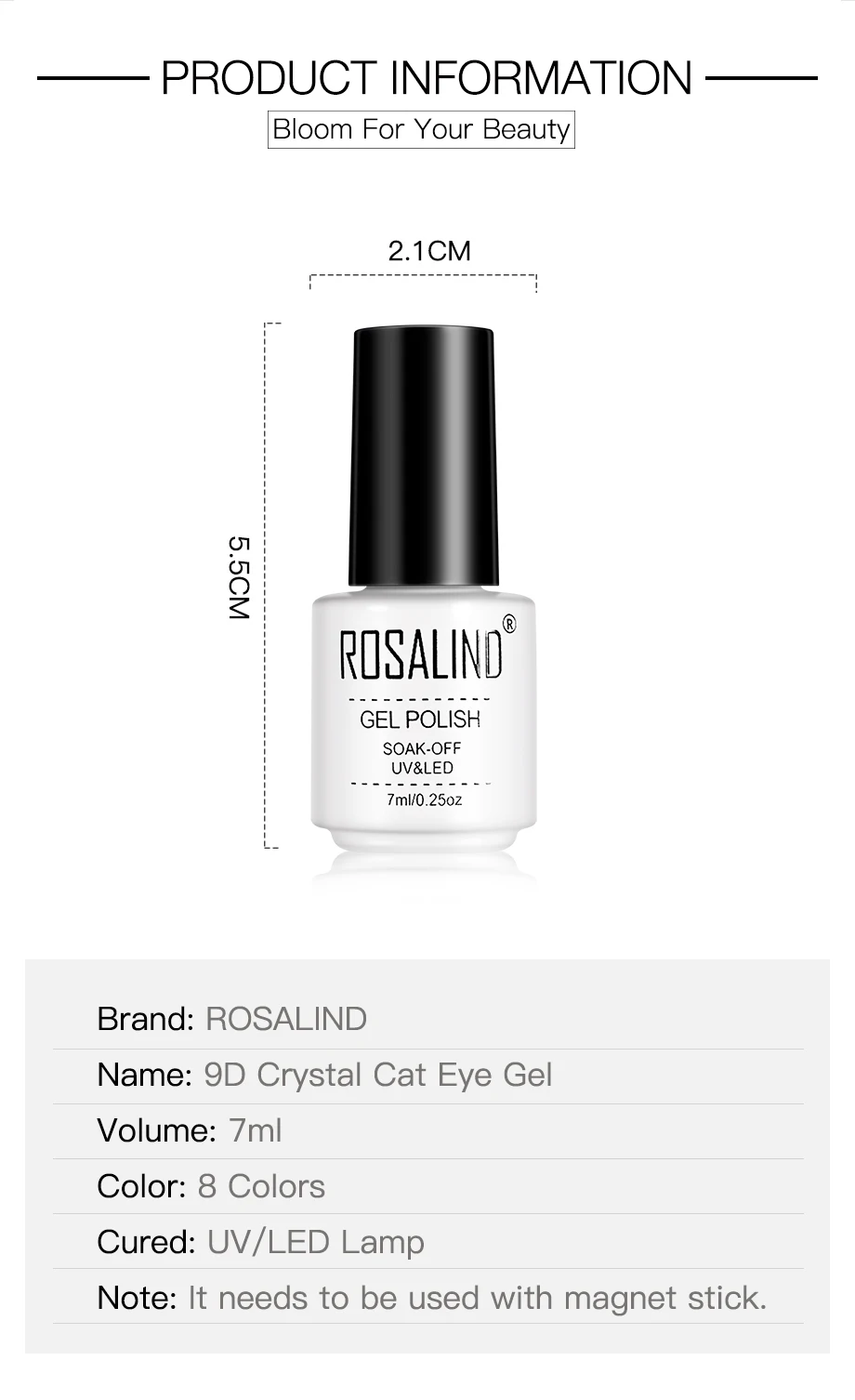 Характеристики Товара:Бренд: ROSALINDНазвание: 9D Кристалл кошачий глаз гельОбъем: 7 млЦвет: 8 цветовИзлеченная: УФ/Светодиодная лампаПримечание: нужна магнитная палочка, чтобы получить эффект-Качество-наш первый приоритет.-Светильник, почти без запаха, мы используем только органическую текстуру для защиты вашего здоровья.-Эффект сохранит от 15 до 20 дней.-Цвета на выбор, цвет меняется при разной температуре.Шаг за шагом:1. Подготовьте ногти с помощью базового покрытия и высушите его под ультрафиолетовая/Светодиодная лампа.2. Нанесите 9D Кристальный гель кошачий глаз. (Не вылечивайте!)3. Используйте магнитную палку близко к ногтю. Чем ближе расстояние, тем более очевидный эффект. Но держите подальше от геля. Эффект зависит от линии магнита и направления, в котором вы его положили.4. Высушите его под УФ/светодиодной лампой.5. Нанесите верхнее пальто и высушите его под ультрафиолетовая/Светодиодная лампа.Для удаления:-1. Замочите ногти в акриловое средство для удаления около 5 минут,-2. Аккуратно Наденьте на каждый ноготь всю эмаль для ногтей.Примечание:1. Чистый объем составляет 7 мл. Так как емкость бутылки составляет более 7 мл, Гель-лак для ногтей с эффектом «кошачий глаз» не будет полностью заполнен бутылкой!2. Что касается геля кошачий глаз, пожалуйста, нанесите гель на гвоздь, используйте магнитную палку, затем вы можете увидеть эффект, такой же, как в описании.