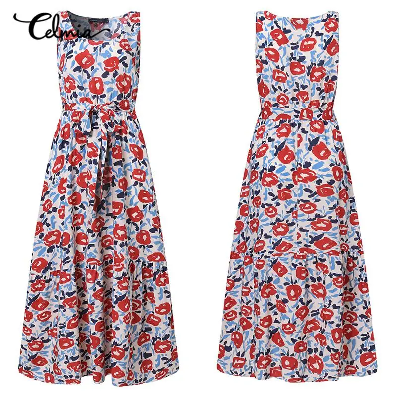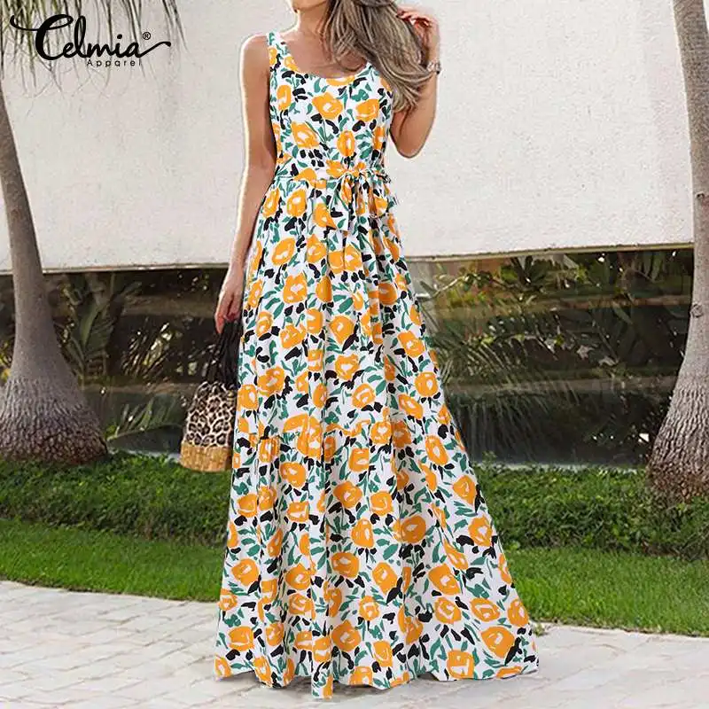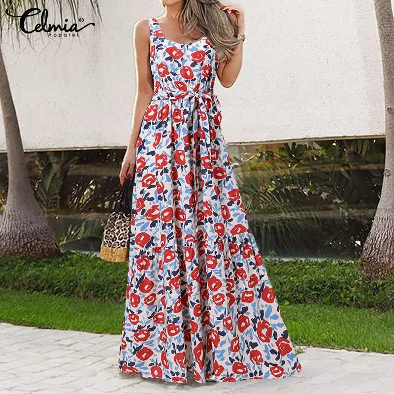 Женское богемное платье с цветочным принтом Celmia, летнее винтажное длинное платье без рукавов, модные вечерние платья с поясом, Повседневное платье 2021