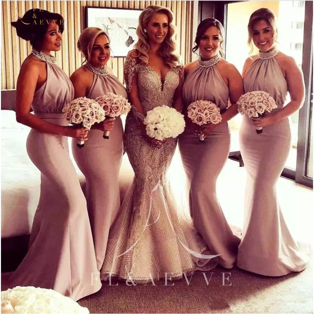 Модное серое атласное платье подружки невесты с высоким воротом и бисером, свадебное платье без черного цвета, платье подружки невесты размера плюс