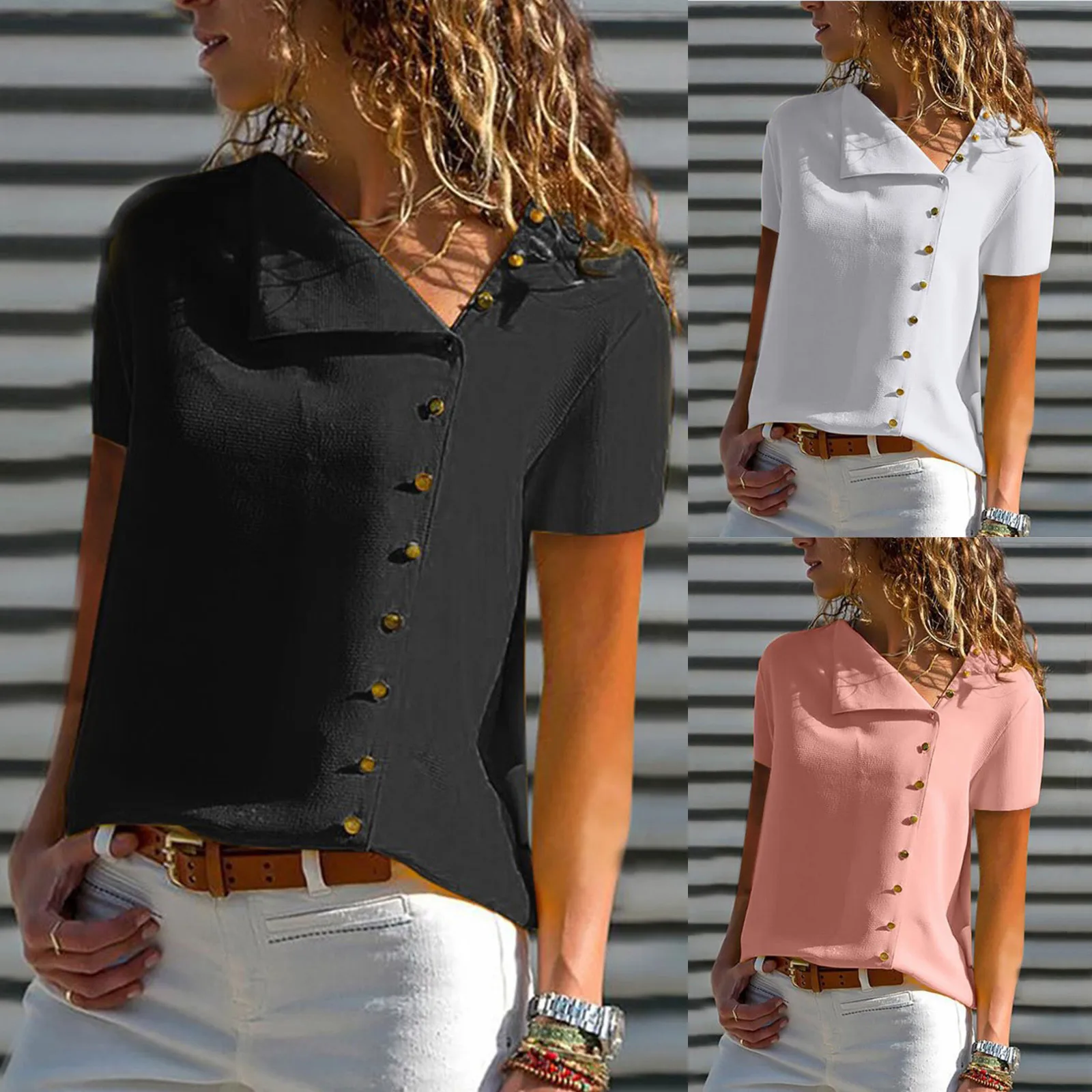 Женская Повседневная однотонная блузка на пуговицах с коротким рукавом и V-образным вырезом, женские топы