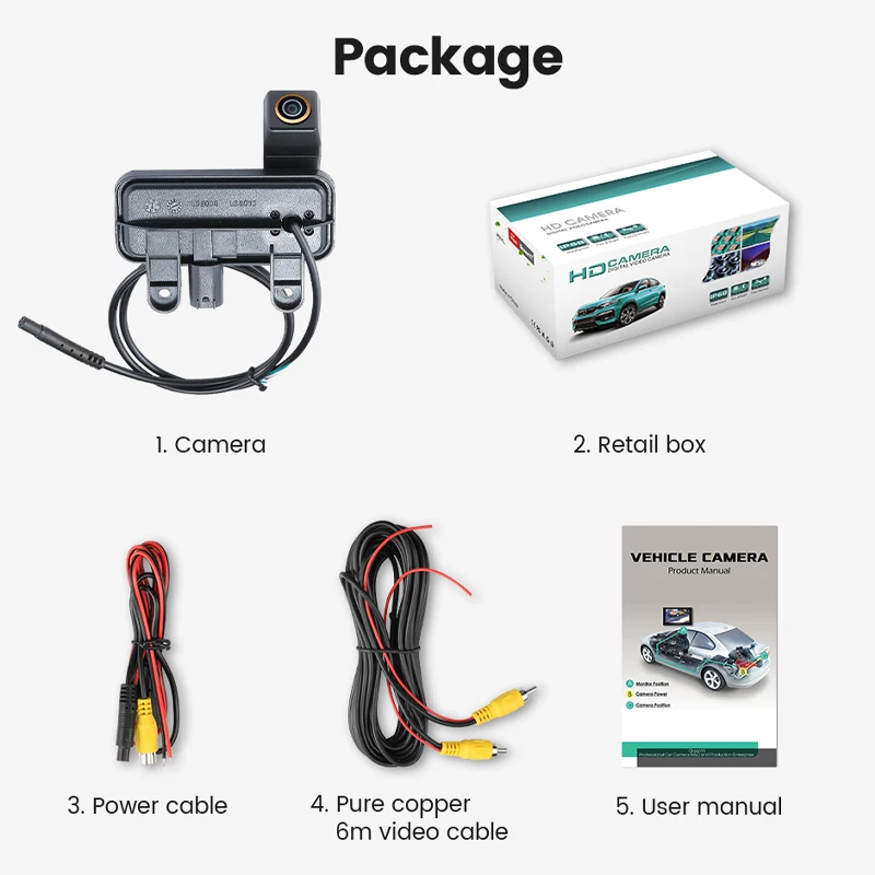 1. Камера заднего вида2. Розничная коробка3. Кабель питания4. Чистый медный 6 м видео кабель5. Руководство пользователя
