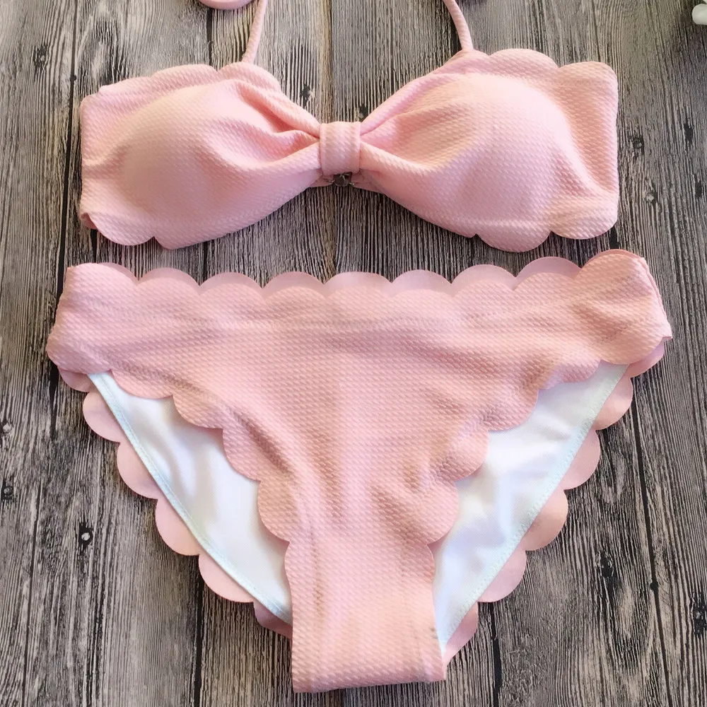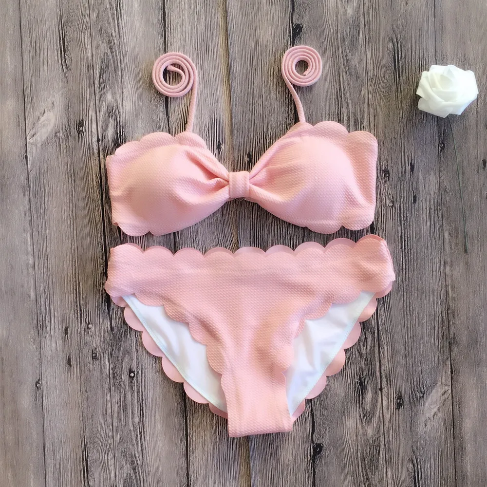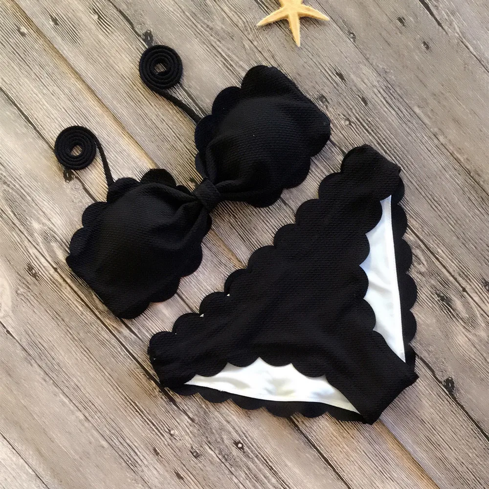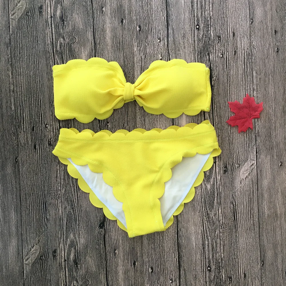 Бикини с эффектом пуш-ап 2021, купальник с фестонами, женский черный, желтый, красный купальный костюм-бандо, женское однотонное бикини, пляжная одежда