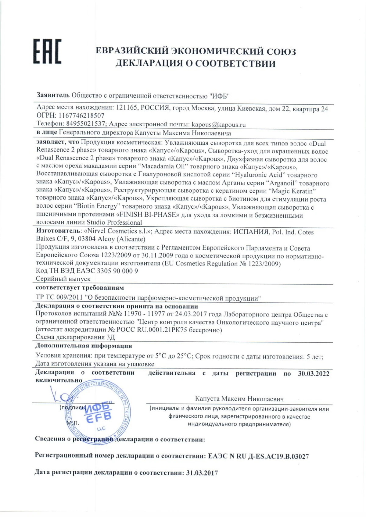 Сыворотка для увлажнения волос KAPOUS PROFESSIONAL двухфазная dual renascence 2 phase, 200 мл