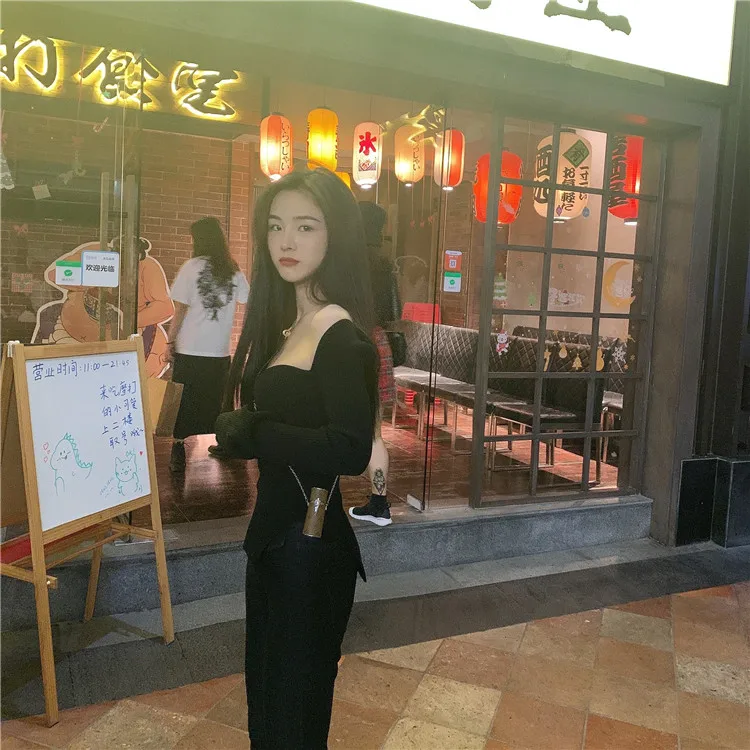 Вязаный свитер с квадратным вырезом, Женский пуловер с длинным рукавом, женский свитер на весну и осень, топы, зимний черный и белый джемпер для женщин, 17027