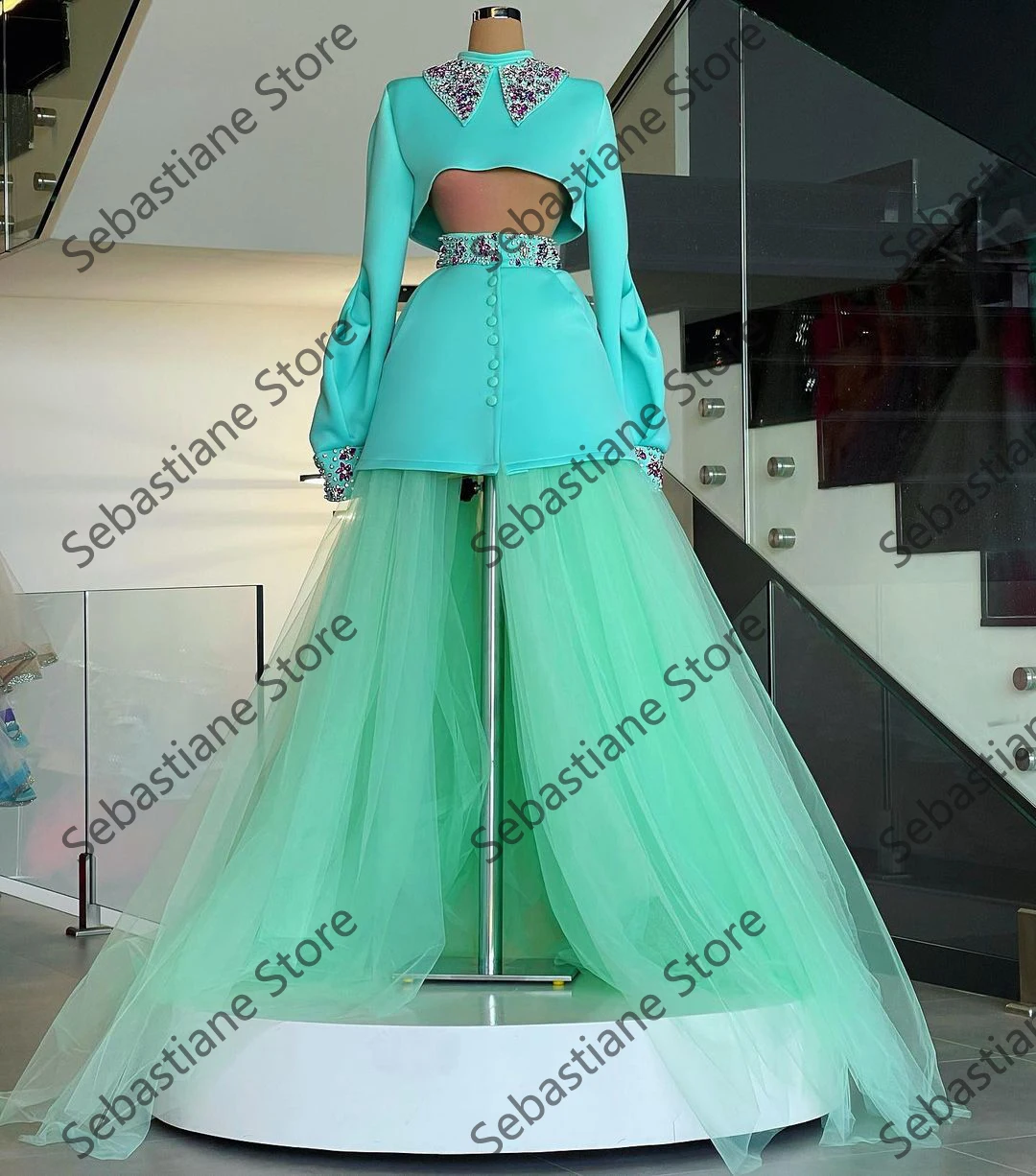 Элегантные вечерние платья из двух частей для выпускного вечера, Длинные вечерние платья с длинными пышными рукавами и кристаллами из тюля