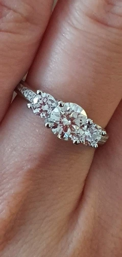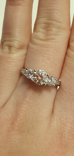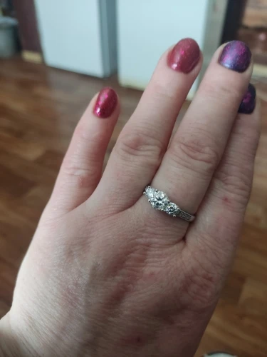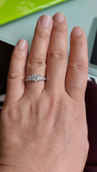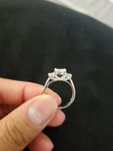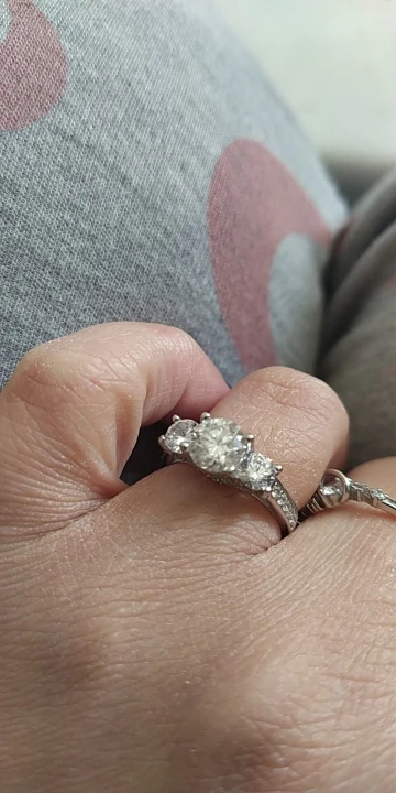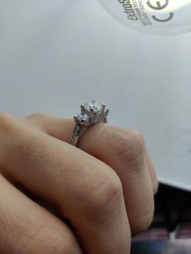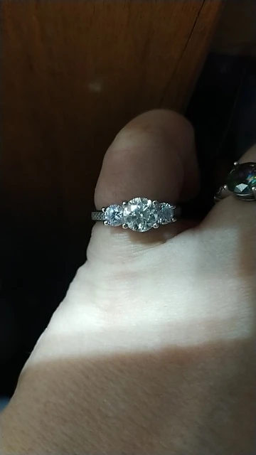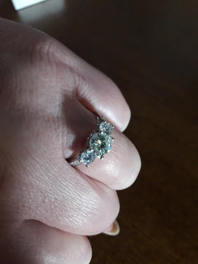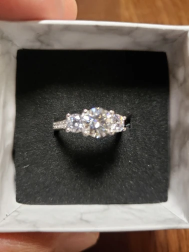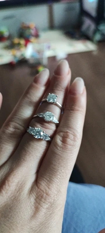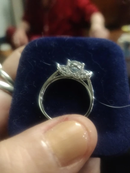 Выглядит колечко дорого где то в отзывах прочитала сожаление по поводу боковых камней небрильянтов но скажу наоборот они подчеркивают красоту основного камня муассанита на который прилагается карточка сертификат .Подарочная упаковка и срок доставки на высоте Благодарю продавца и создателей классического образца ювелирного искусства.