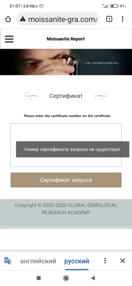 Сертификат подлинности - фальшивый, даже нет такого сайта, который указан на нем, чтобы проверить номер сертификата. Делаю вывод, что и камень - не муассанит. Поэтому ставлю 1 звезду! открою спор, с продавцом даже общаться не хочу!