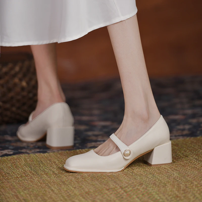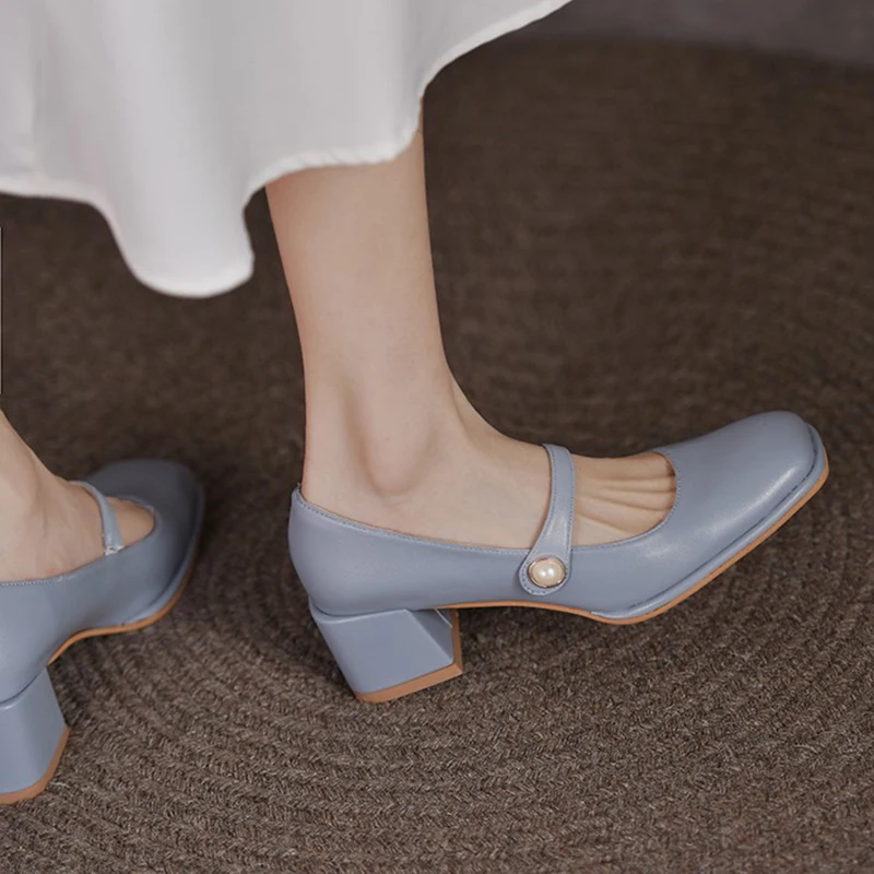 Женские туфли с квадратным носком, туфли-лодочки с жемчугом, на квадратном каблуке, модельные туфли на среднем каблуке, синего и черного цветов, 9340N